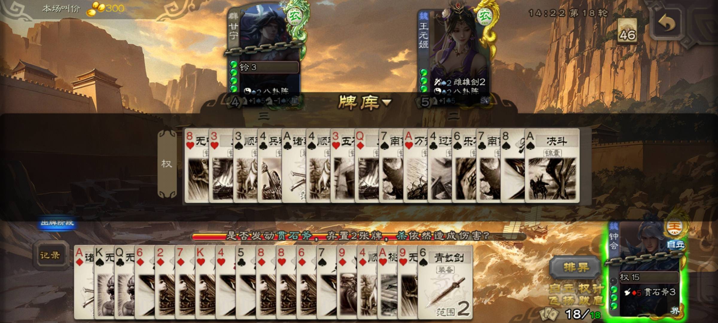 炸框了无奈选了个烂钟会当地主,本来以为又要挨一顿毒打然后输掉游戏,意外的居然扛到了15分钟赢了,烂甘宁闪桃无懈卡自己技能,这把我没对甘宁用过一张牌,也没出过一张锦囊,爽蹲坑。