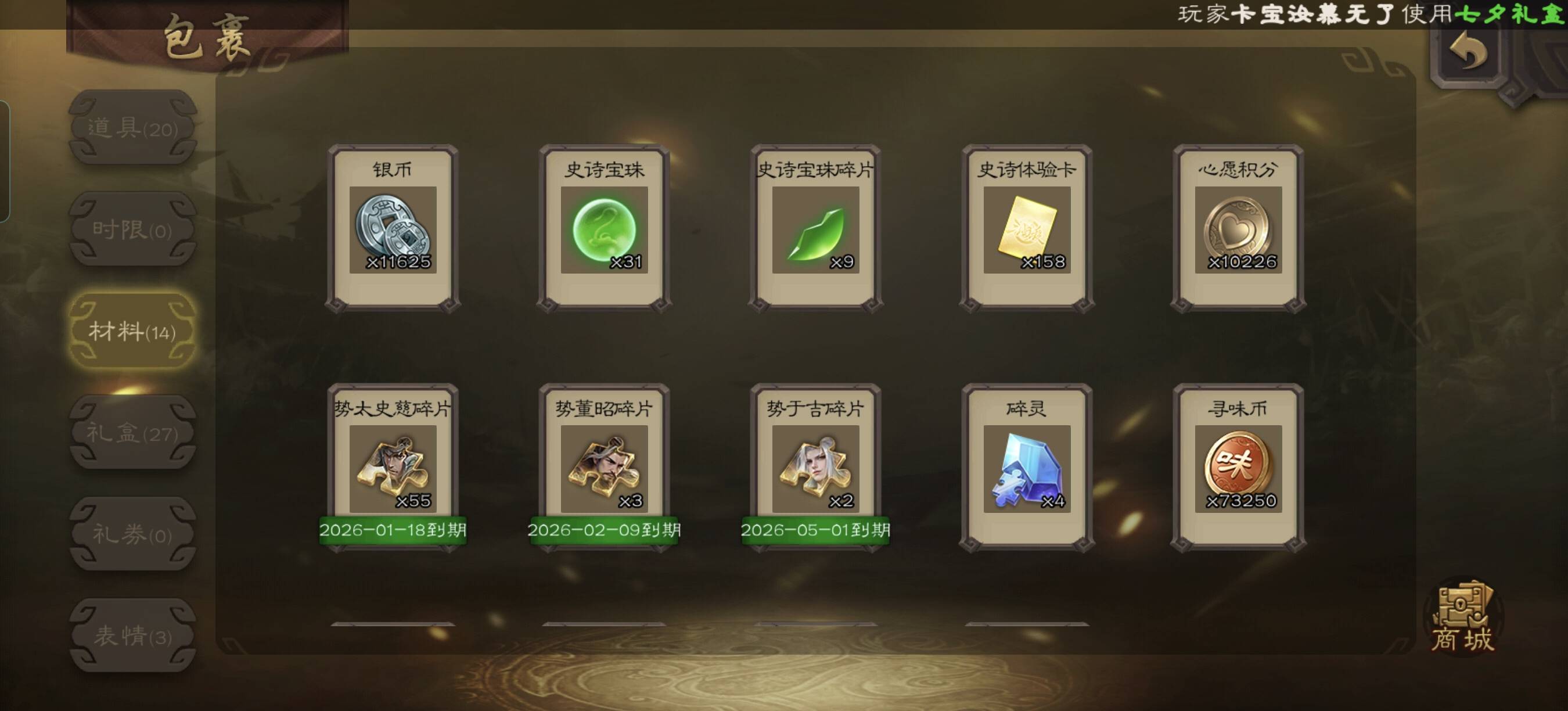整体来讲,这个碎片的门槛仍然很高。0氪和摇树将军完全做不到,这里建议这类的将军直接放弃,即使是周卡年卡拉满也需要相当的时间和投入,而且还需要花很多的时间来控制预算和进度。现在我已经可以保证保底出,周末的时候6组盒子出了8个碎片,进度增加了不少。后续我就靠寻味三国和斗地主商城来整剩下的三个碎片,现在这个活动下来我在一开始有存元宝的情况下都花了1000块钱(实际上会有溢出,全部真实用在这个盒子上的大概400-500这样),感觉还是很亏很亏的,从这里也基本上可以得出结论,如果没有任何准备和氪金,是很难在一年内仅凭年卡换的到势太史慈的(我氪了大概400元双倍,还有节钺令的110盒子,开了18张周卡,才有这个进度)。所以我个人并不推荐大家效仿,我已经接近两年没在盒子里出过权五以上的东西了,但是我也想明白了,做不了欧皇就做肝皇,放着玩就好,这种武将收集大不了做一个年更系列,准备存一些元宝,等马年碎片武将,新年的时候再冲。计划存势魏延,我对于菜刀武将情有独钟,我也好久没出过权三以上的东西了,希望能欧一把。