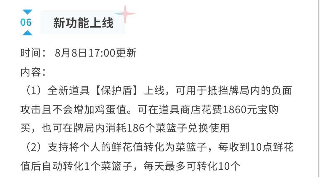 今天上线了一个新道具——保护盾,这个效果应该和新手保护伞(如下图所示)差不多,估计后续菜篮子周卡、月卡也该上线了😏