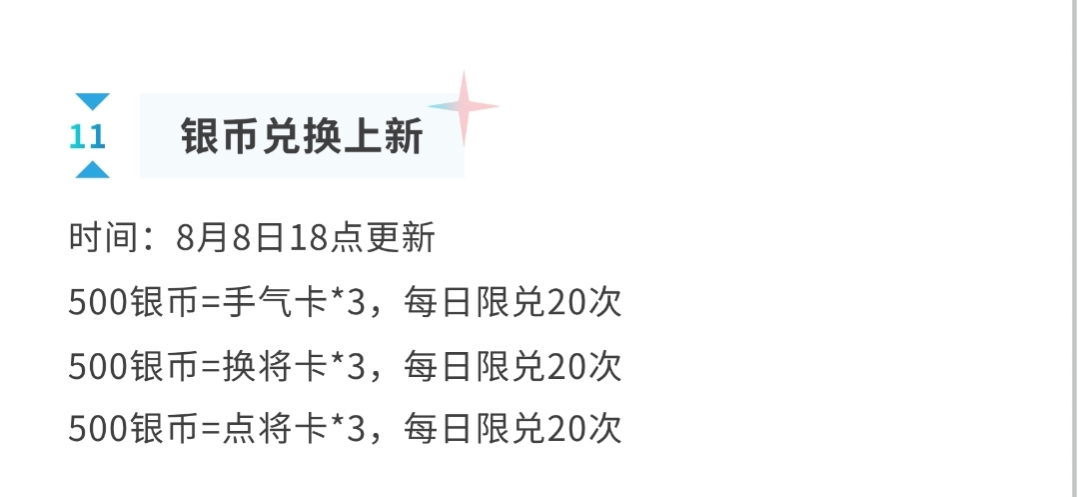 反正银币兑换三卡我是不推荐的,除非你银币多的用不完,但是银币多的用不完的玩家基本都是氪佬,关键氪佬也不缺三卡,多余的银币我换点盒子、换点令和甲他不香吗?要我说这个兑换就是过来坑大家的银币的