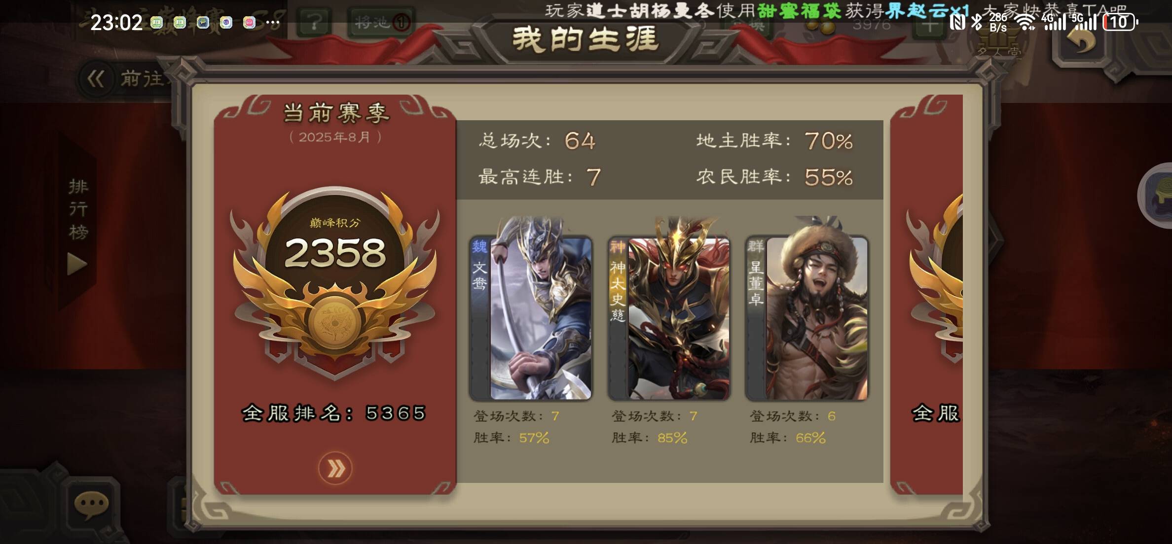 界吕布,无双姑且算一个小强中,贪个拆顺大概率能打中,而且地主6上限被扣一点也问题不大。高分局应该比较乏力,但也不是不能挑战。