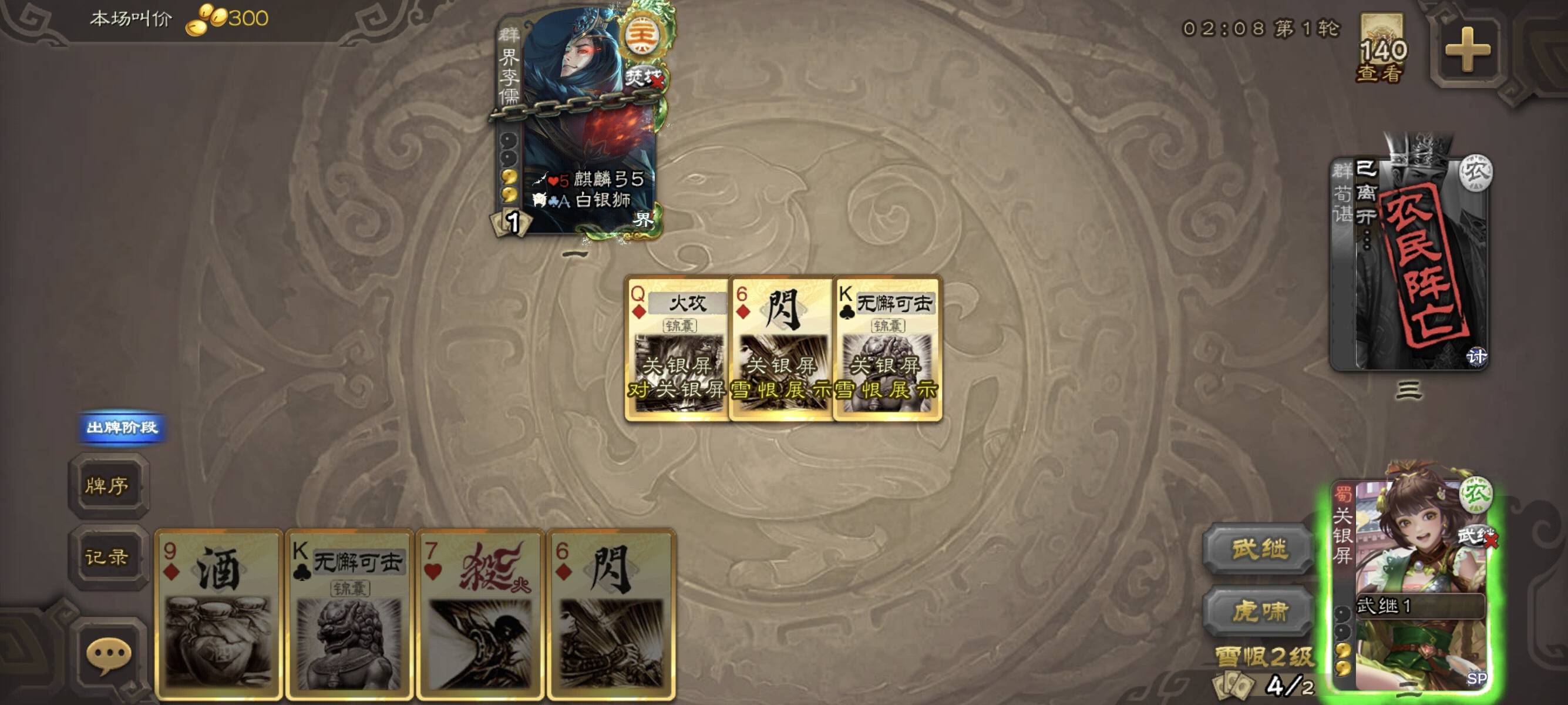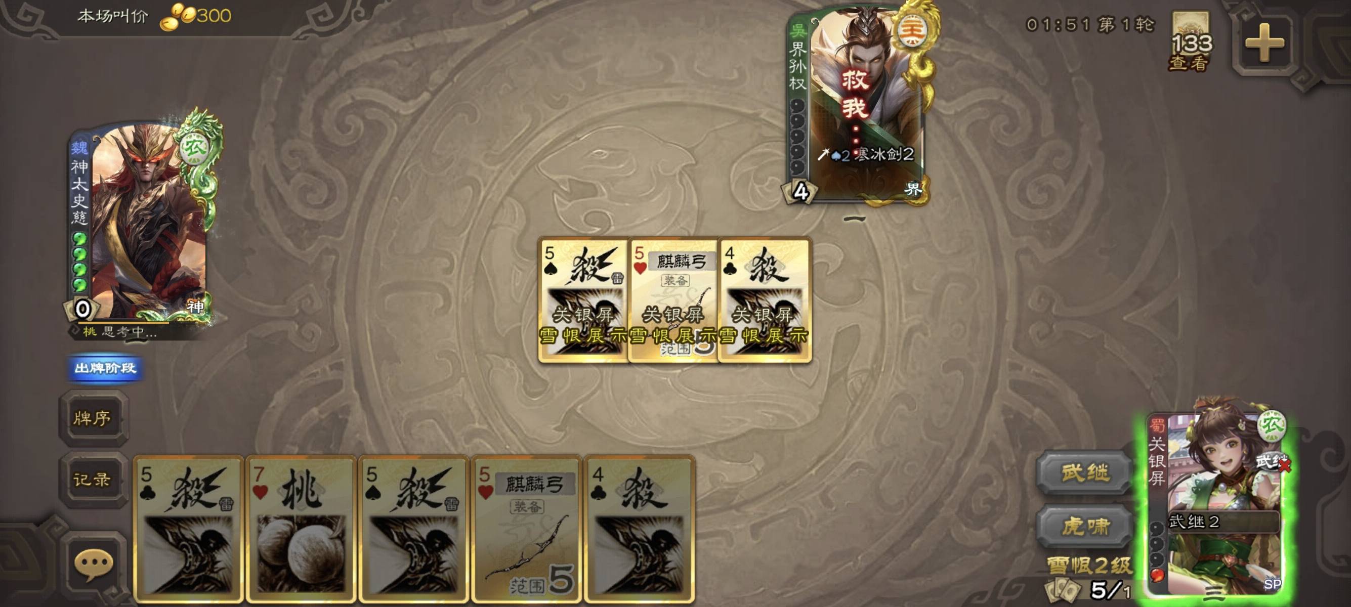 关银屏这个武将不得不说改的确实很不错呀,强度直升天宫将。回合外掉过血到回合内能打四刀(转化杀没被闪的情况下),妥妥爆发将,还有直伤。已经拿关银屏斩下许多对局,好玩爱玩😁