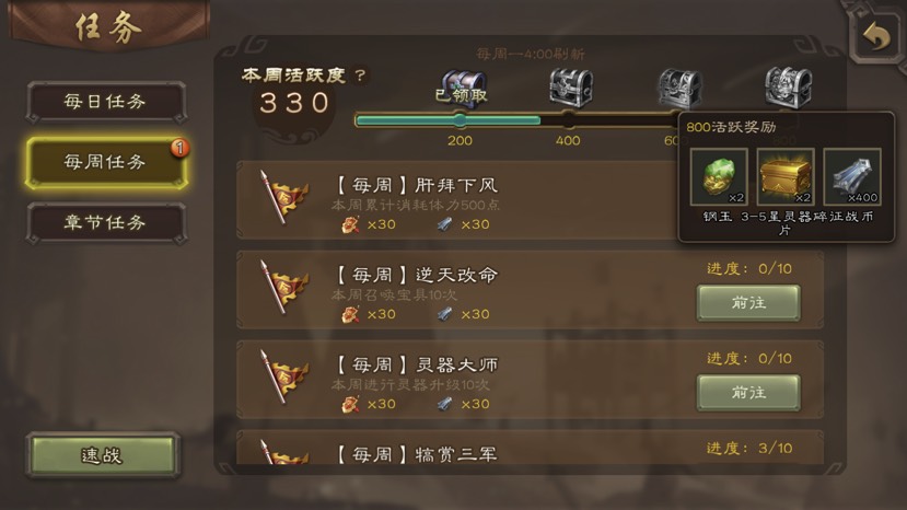 需要每周完成800点活跃,但是只有7天,我是每天多完成一个商店购买、武将升级、灵器升级三选二,一天110点,不够的周末从每周任务里面凑