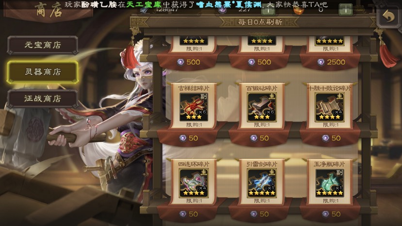 灵器碎片不建议买,每天刷新不是天天都能买的到一种灵器,可以买五星的紫金宝匣和玲珑玉佩碎片,早点玩上满配月英,靠白票五星副灵器还是很慢的