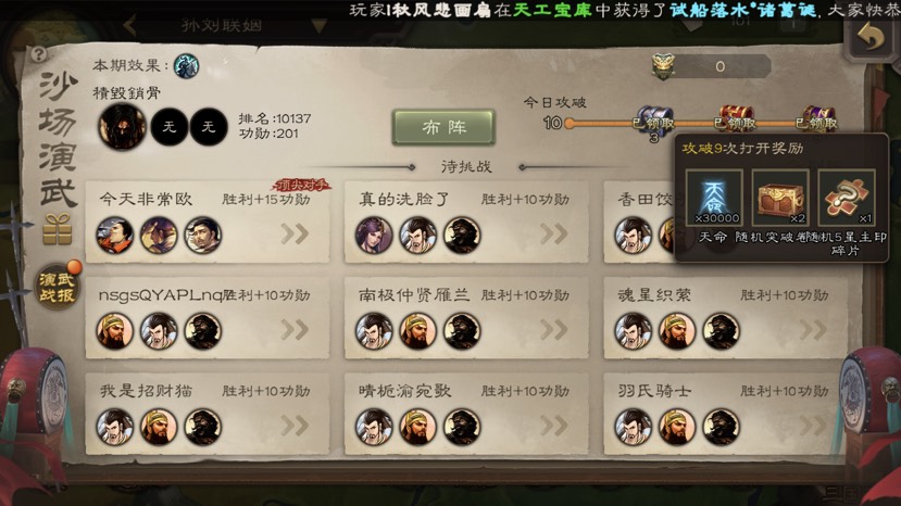 每天打9-10个对手,重复的碎片多总体不如每日演武给的好,别忘了周一凌晨至上午也能打
