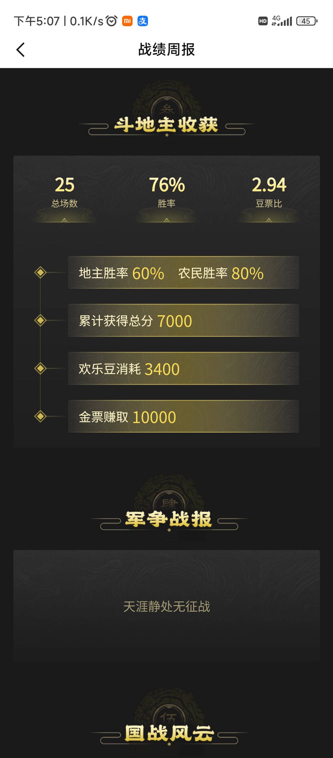 昨天拿了斗地主之王发了个帖子,我一万五千局总胜率60%,地主胜率62%,农民胜率58%,但是这里面有差不多六七千局是以前地主强势的时候打出来的,农民在现在环境里胜率肯定是比地主高的,为了提高胜率拿斗地主之王,我基本都会苟农民,所以我上周的身份胜率里地主只有60%,农民有80%