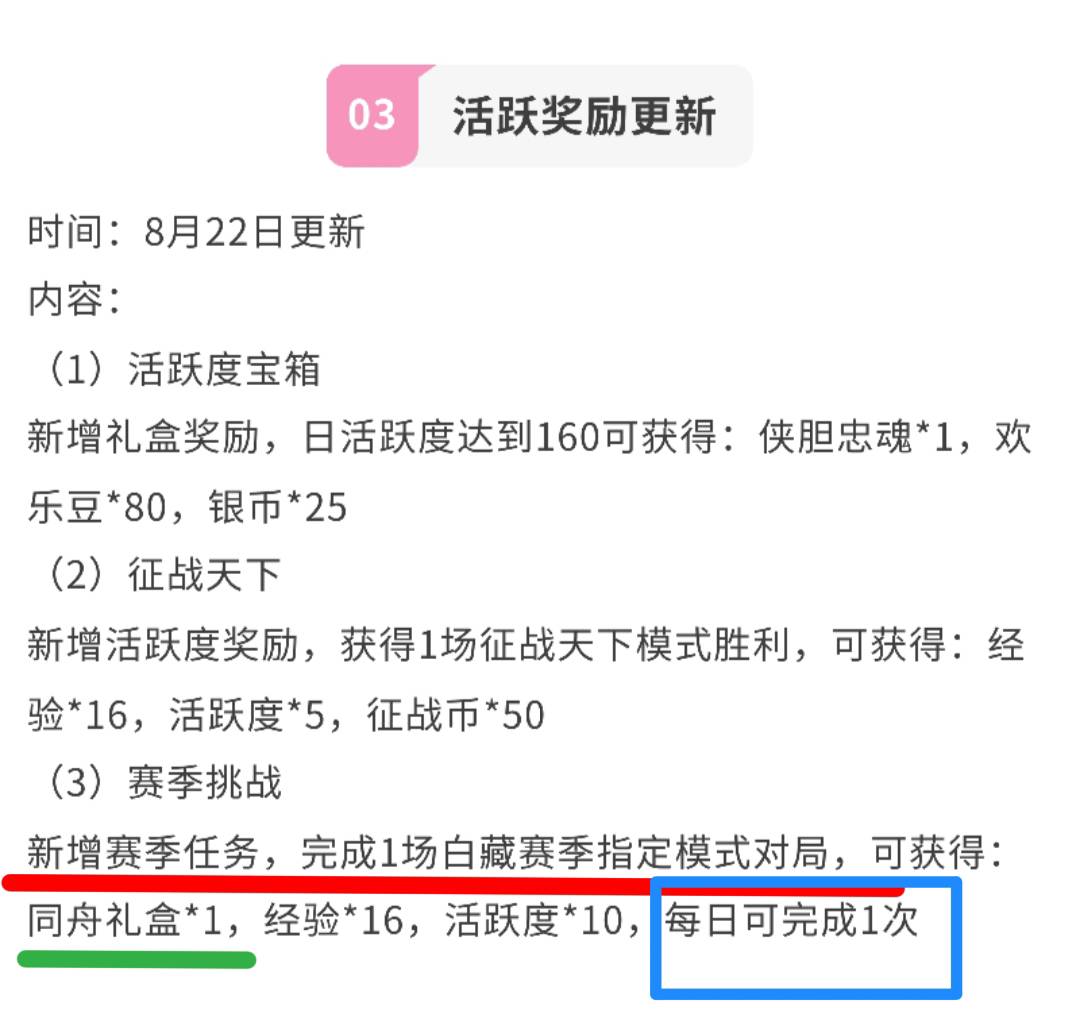 如图,有图为证,原本每天完成一局比如排位军八斗地主就能得一个同舟礼盒,现在被策划不发公告给取消了,注意这是每天都有的而且并不是160活跃度那个盒子,160活跃度给的是谋吕布盒子,但是这个每日完成赛季对局给的一直是同舟礼盒,两个不一样!!你们现在上号看不到那个任务了,希望团结起来让策划加回这个盒子!