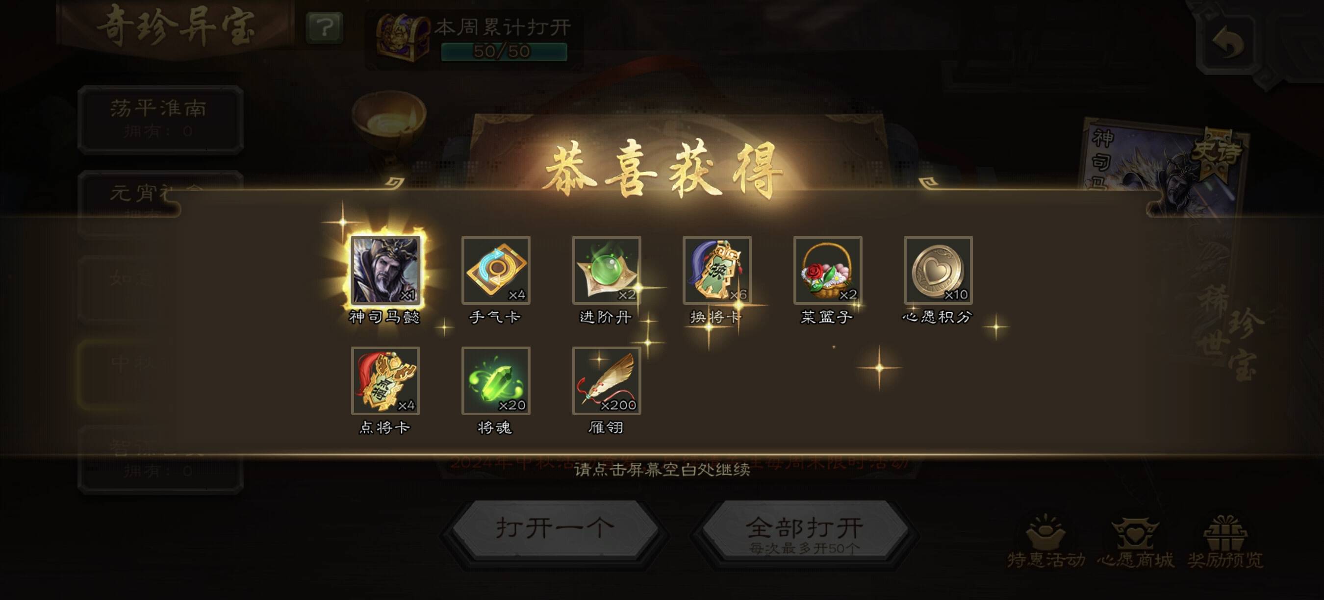 张奋是我第一个宝珠将。这次国庆皮肤上线,我便以250抽、345块为他圆了梦,没想到,用附赠的银币换的十个盒子,竟开出了神司马,堪称意外之喜!