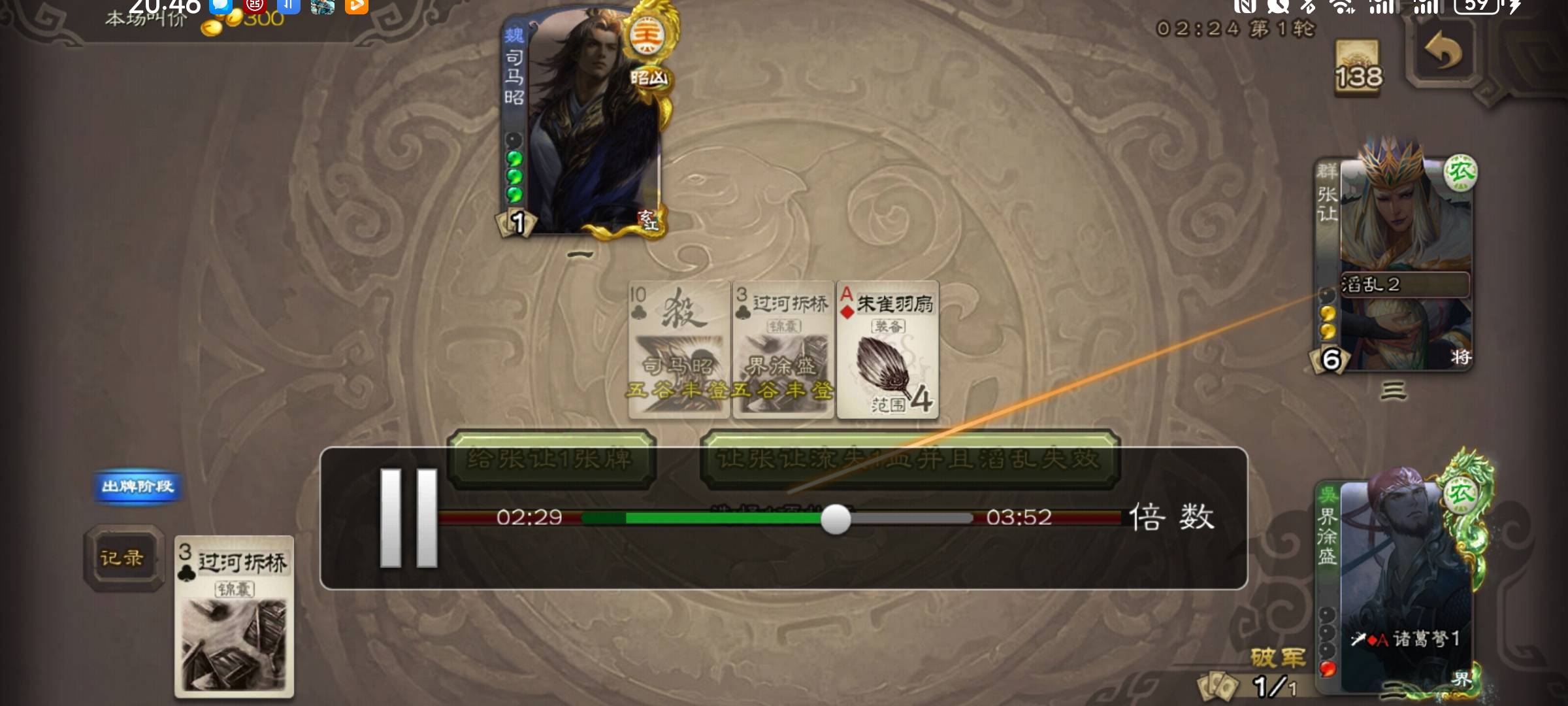 司马昭空城,张让五谷,司马昭拿的明杀,大宝把连弩给张让。张让手里一张杀,滔乱个酒,拿走大宝过河拆桥,再滔乱顺手拿走司马昭明杀就完杀了,这神仙队友🐶P操作,白白送了300豆子#三国杀将星筑梦