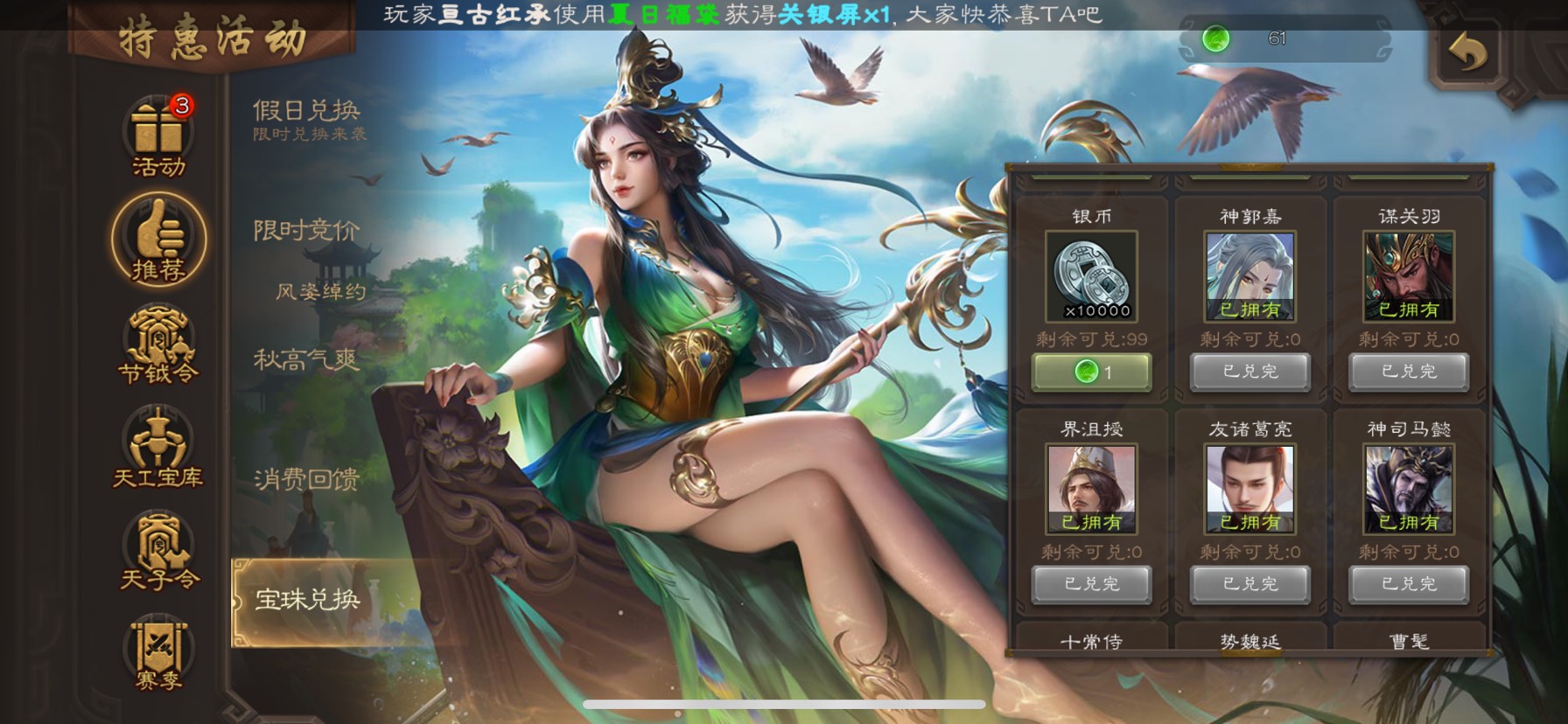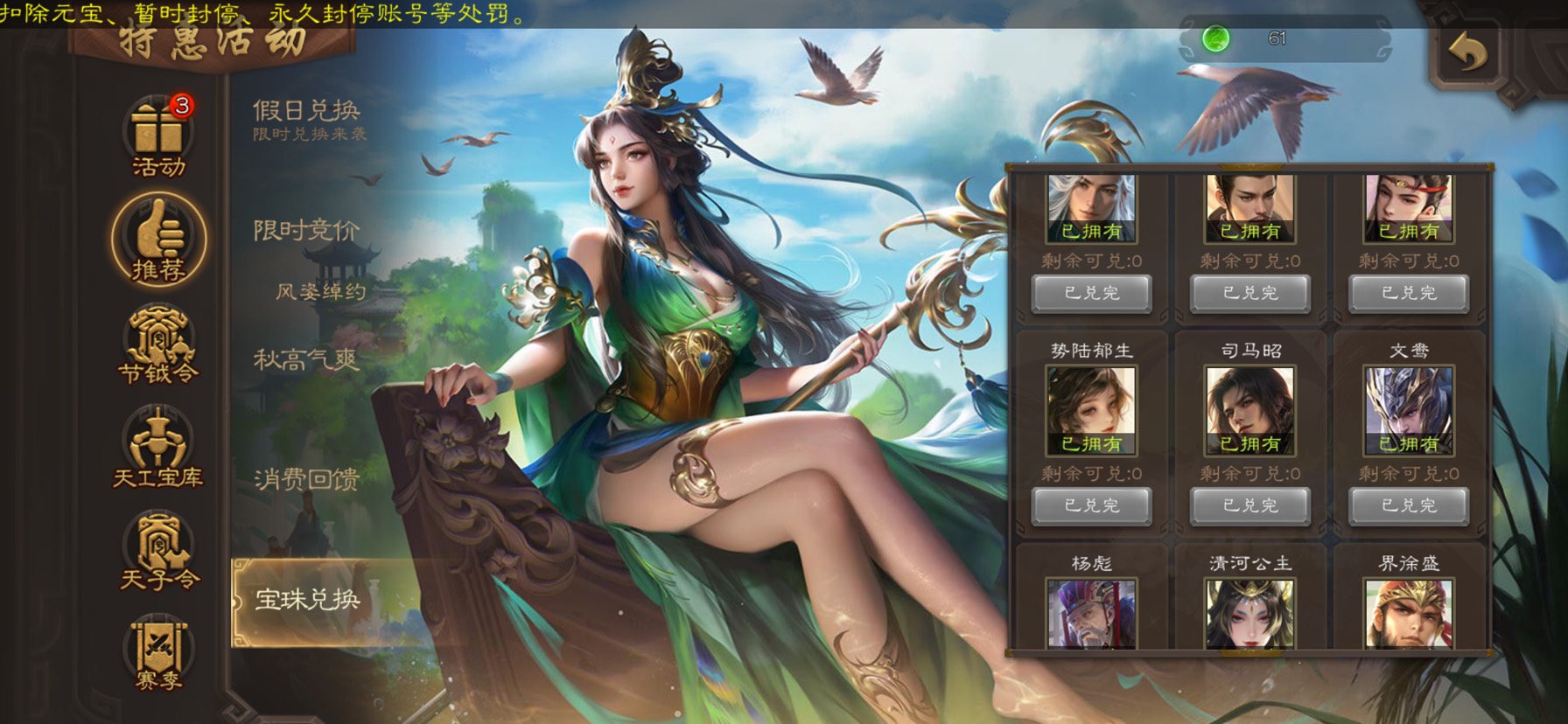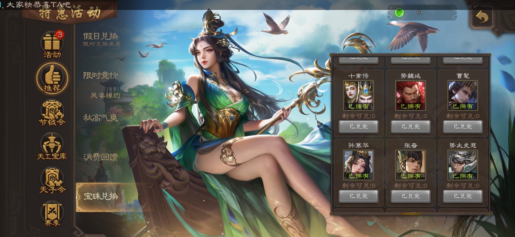 各位将军们,现在有60宝珠不知道该换谁,希望各位将军推荐,本人主打斗地主,下图为我拥有的武将
