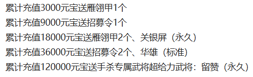 除了上文提到的180签到令外,自然也有更利好土豪的获取方式,也就是如今消费反馈以及消费材料兑换的雏形——充值反馈,只需要实实在在充值1200r就免费赠送手杀专属超给力武将