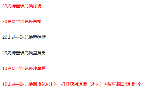 2023年七夕,审配陈登诸葛瞻神赵云接替了沙摩柯沮授留赞祢衡老四人组的位置,后续诸葛瞻开放合成,张让又代替了诸葛瞻的位置,说是限时兑换,却一直持续到24年春节才又换回老四人组,一直持续到今天,只有偶尔的大活动审配神赵等才会一并加入材料兑换