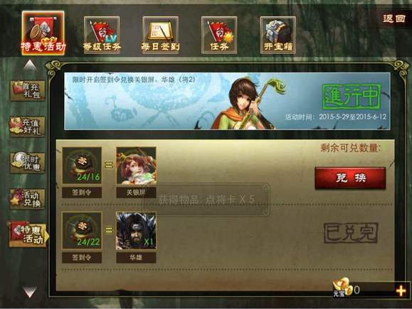 此后,一直到游卡接手的时代,留赞的定价便一直固定在2000元档位。下图为16年游卡时代第一个大活动:七夕,充值反馈的方式微调成了大小材料兑换,也是现在材料兑换的雏形,比较良心的是在当年的中秋活动中,游卡终于把充值反馈人性化的改成了消费反馈,总算不用非要一次活动充值两千块钱才能拿到武将了……