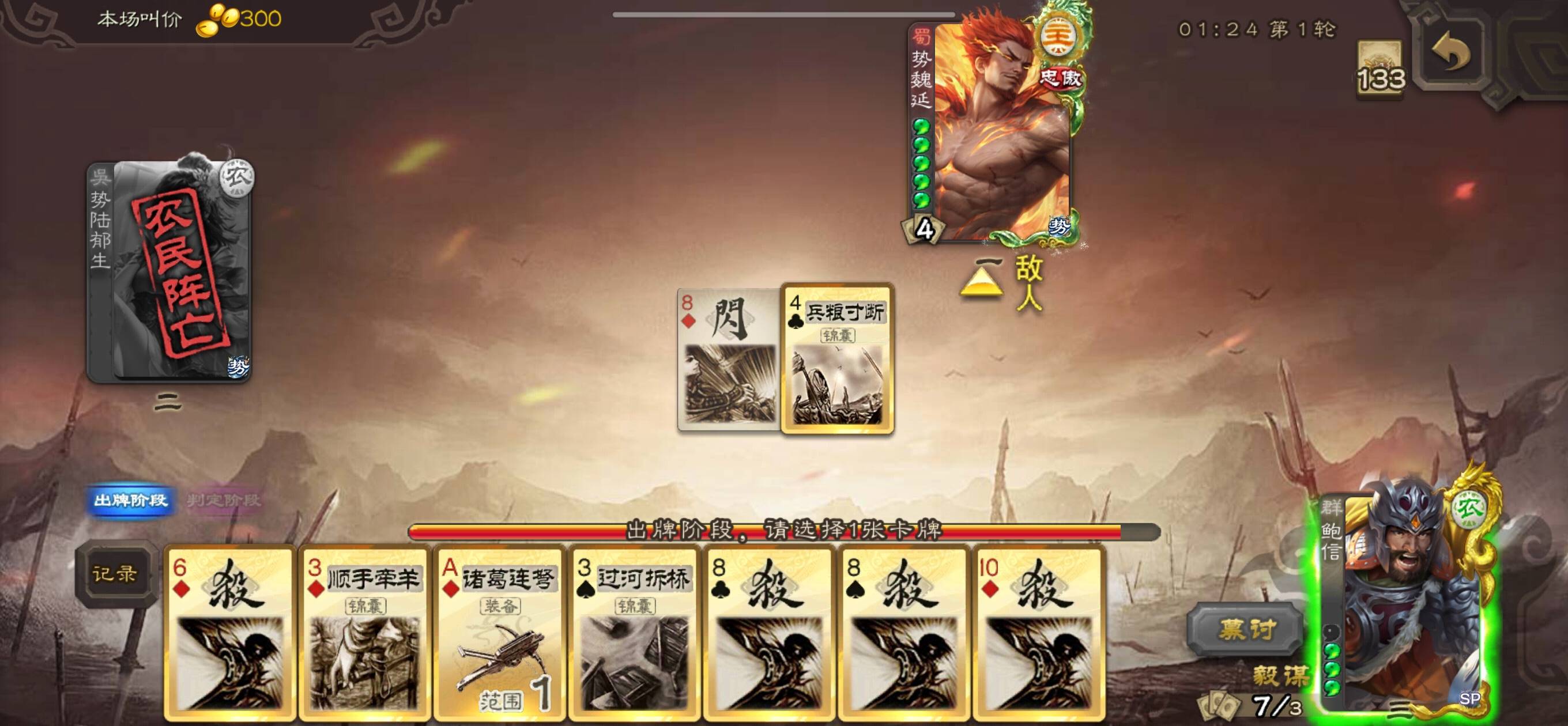 唯一已知的是魏延手里有一张藤甲,是他打我之后我递给他的,那次我运气好摸到杀,但是被兵了,现在就是该我出牌了。
