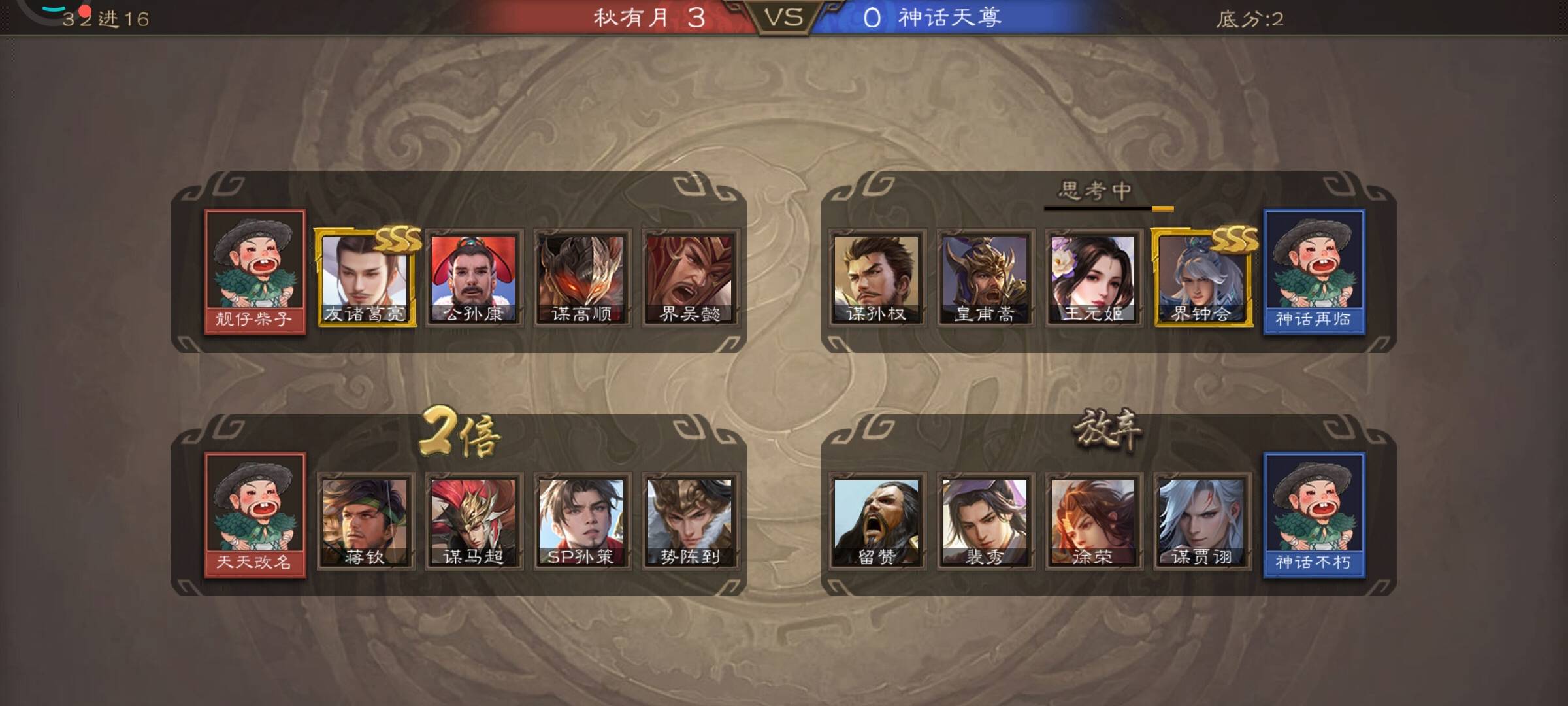 但第三局蜜汁操作,在柴瑾将框有友诸葛、自己将框最强将仅为谋马超的情况下果断叫地主,不让柴瑾友诸葛上场。最终换将也没换出什么强将,勉强拿个谋高顺打农民皇甫嵩、徐荣,局末阶段也是打得比较犹豫,运气+实力,最后非常勉强取得胜利。