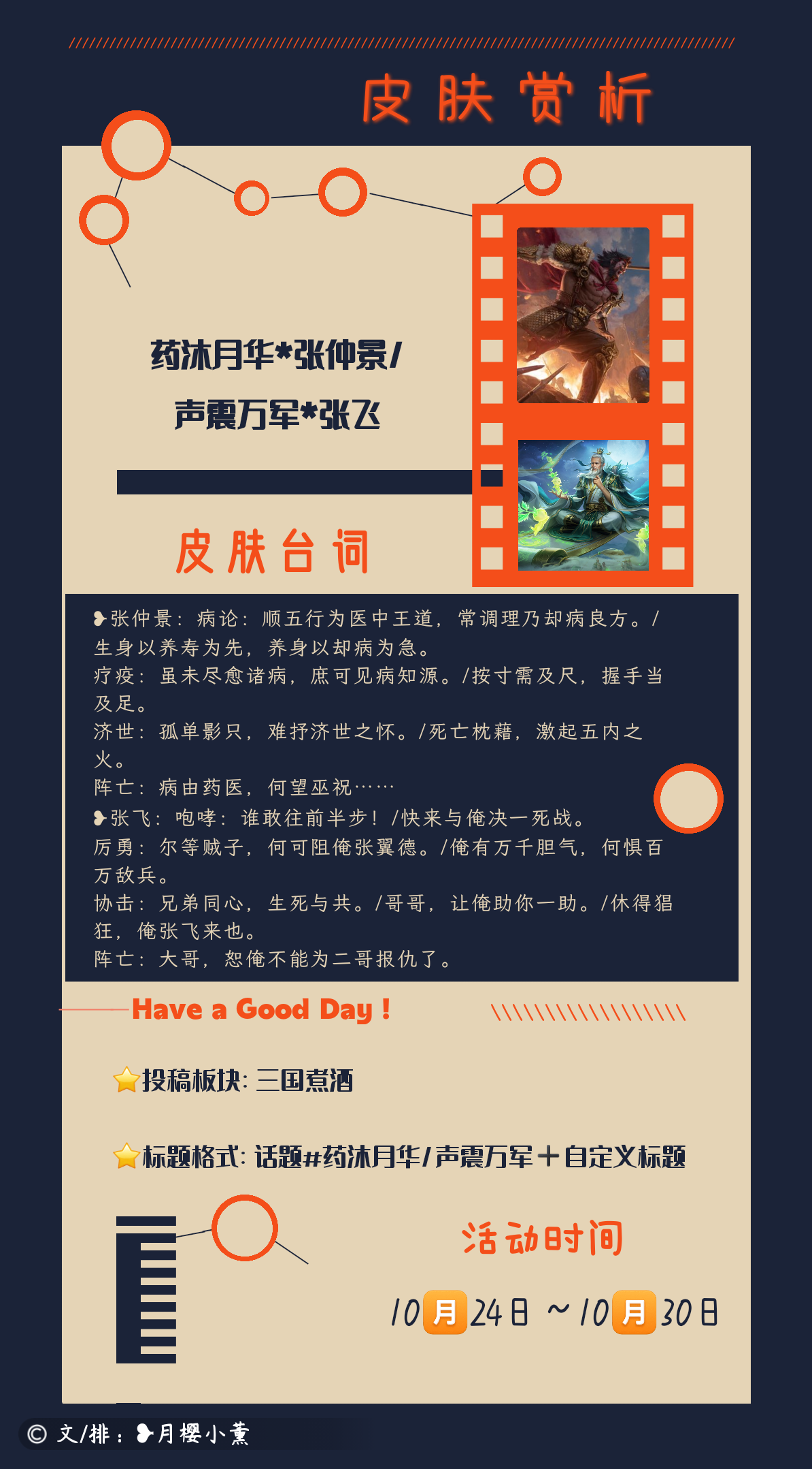 ❥皮肤赏析可以从:历史背景,场景环境,人物历史典故,兵器,武将台词意境等方面着手来写,着重于皮肤细节部分的刻画和剖析,旨在通过皮肤赏析来让大家了解到武将的历史故事,从而明白皮肤作者所想表达的含义。