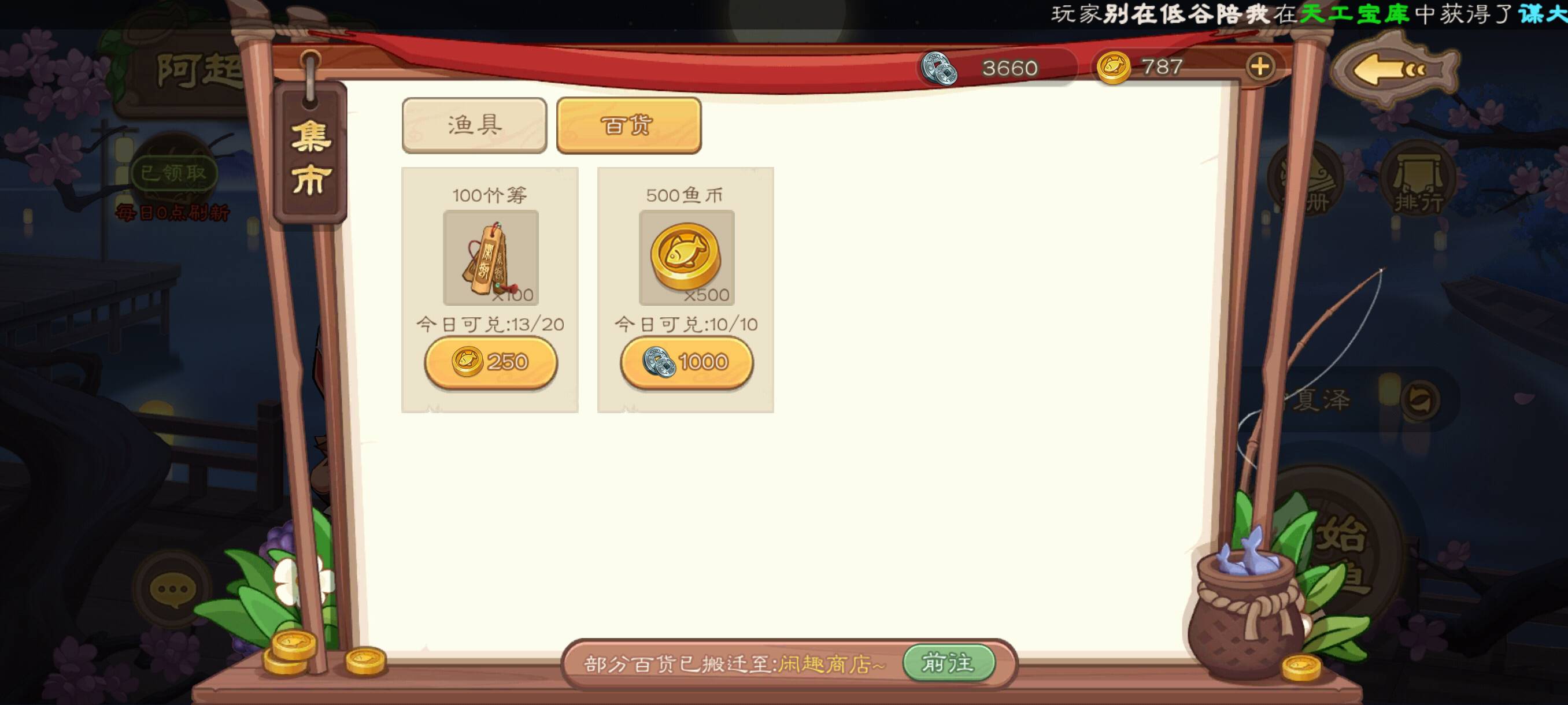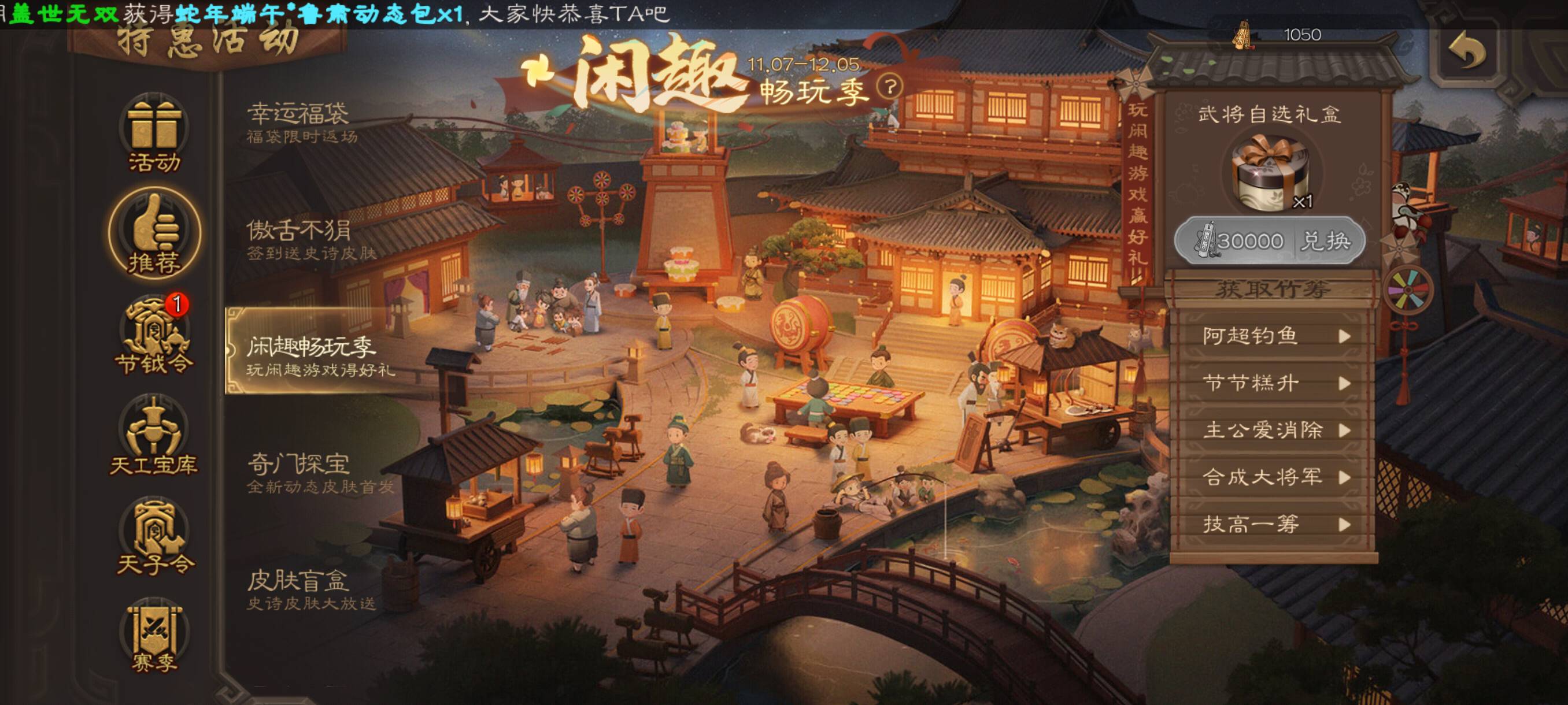 活动期间,每天可以游玩闲趣百市中的四个游戏获得最多100个竹筹。同时,每天也可以获得5个鱼饵,250个鱼饵可以换取100个竹筹,最后30000个竹筹可以换得最终大奖。