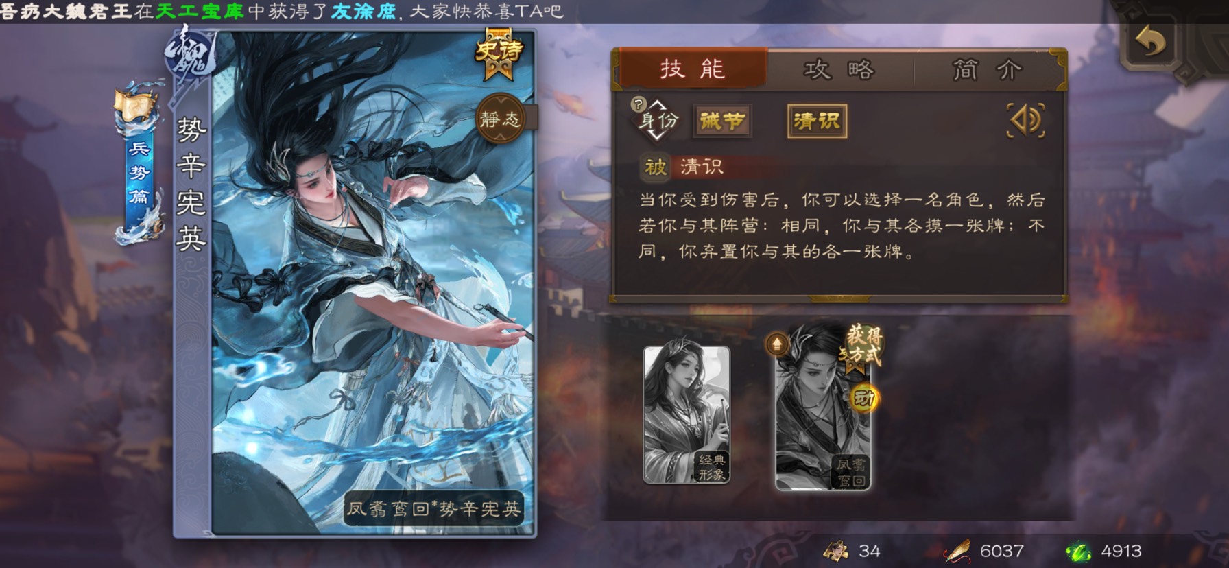 首先看她的二技能清识。是一个卖血的技能,选择自己就是摸2,选择队友就是一人摸1,选择敌方可以下别人的关键装备,这个是自己选择拆牌的,算是非常好理解和一个比较灵活的卖血技。注意,这里的阵营就是农民啊反贼啊主忠啊这种并不是魏蜀吴群势力。