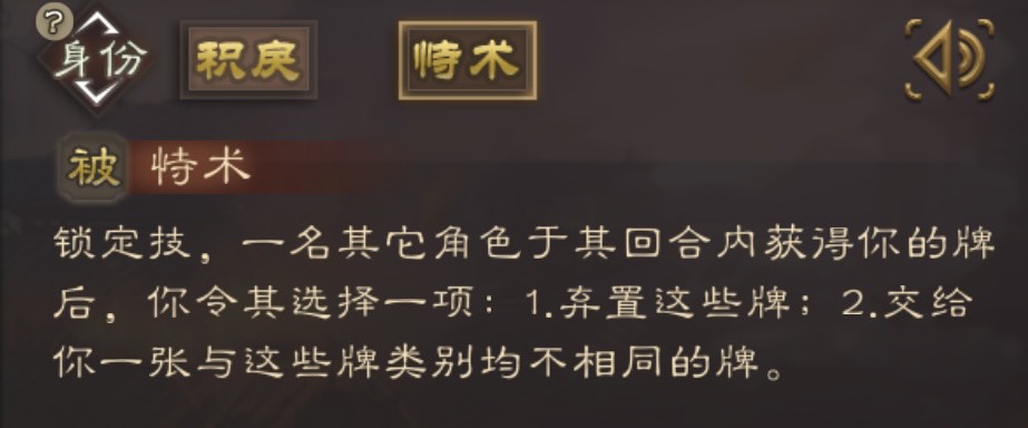 二技能:恃术,算是个手牌防御技,如果被顺手或者偷牌对方必须选择