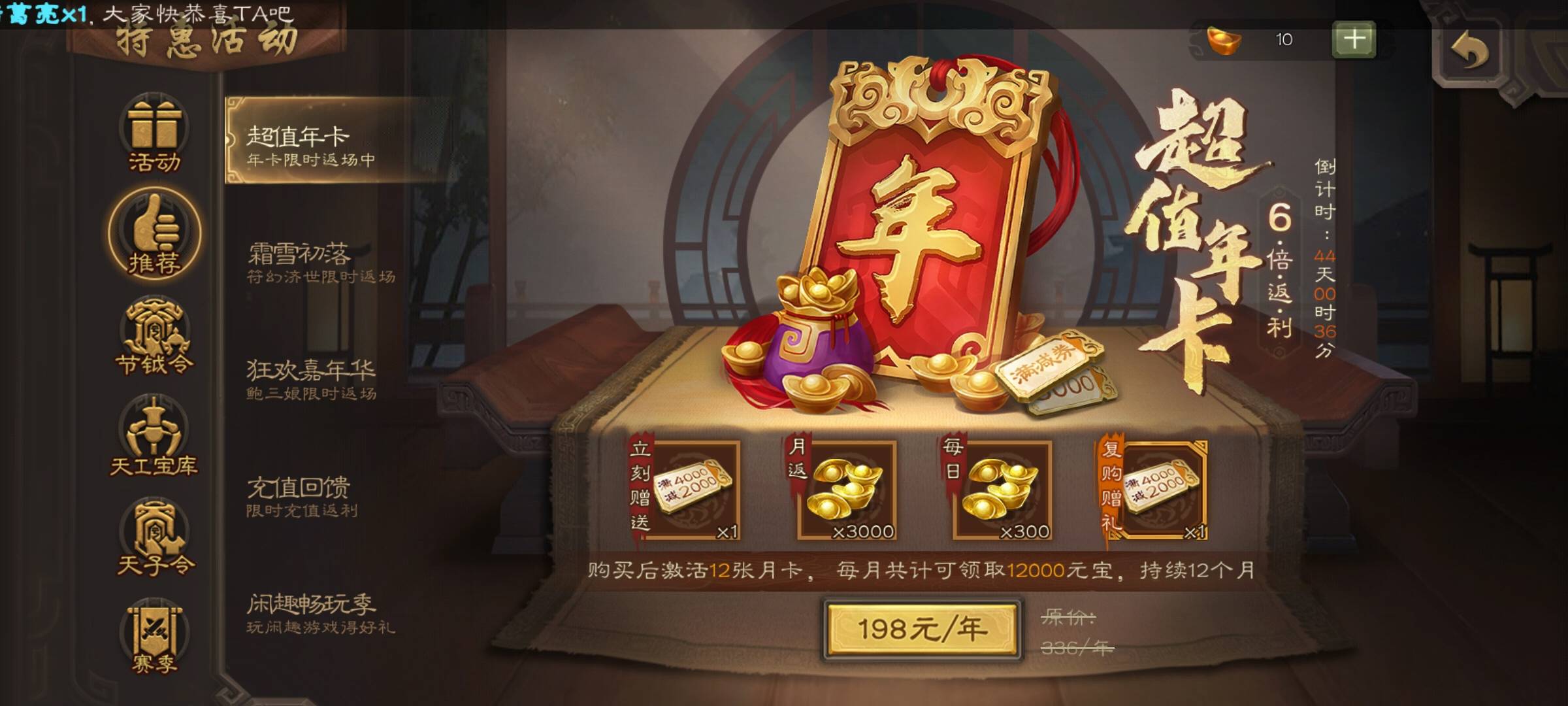 虽然这样一看收益还不错,但是当你买了年卡,也就意味着你每天都必须上线,你不领他也不会帮你领,况且有些将军本身就有想跑路的打算了,所以这种需要大量时间签到的对于他们来说,就是可有可无的克金活动,当然啦,如果你想要养老,那你买一张年卡性价比确实不错