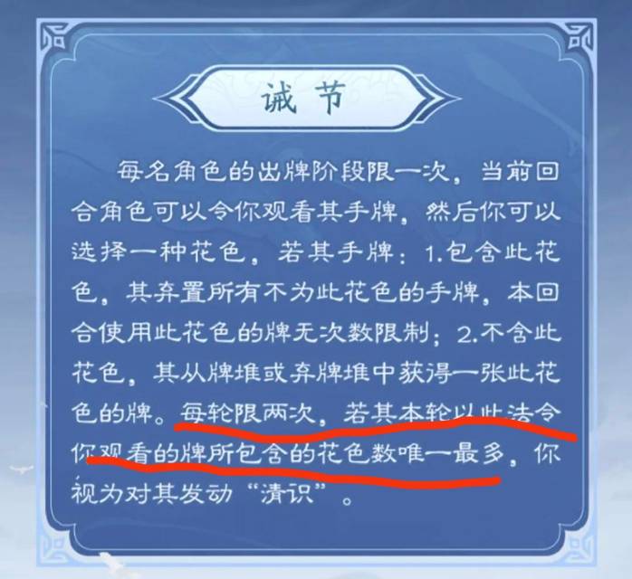 因为她诫节里面描述的是:观看的牌所包含的花色数。花色不就那四种么😂没手牌应该发动不了诫节,也就是说本轮第一次发动诫节的时候必须要最少有一个花色,花色数最少就是1,所以肯定能触发清识,本轮想额外发动第二次清识,就必须队友发动诫节时手里牌的花色数必须要大于第一次发动诫节时的那个花色数(不是2就是3,因为4花色发动诫节必弃牌)。