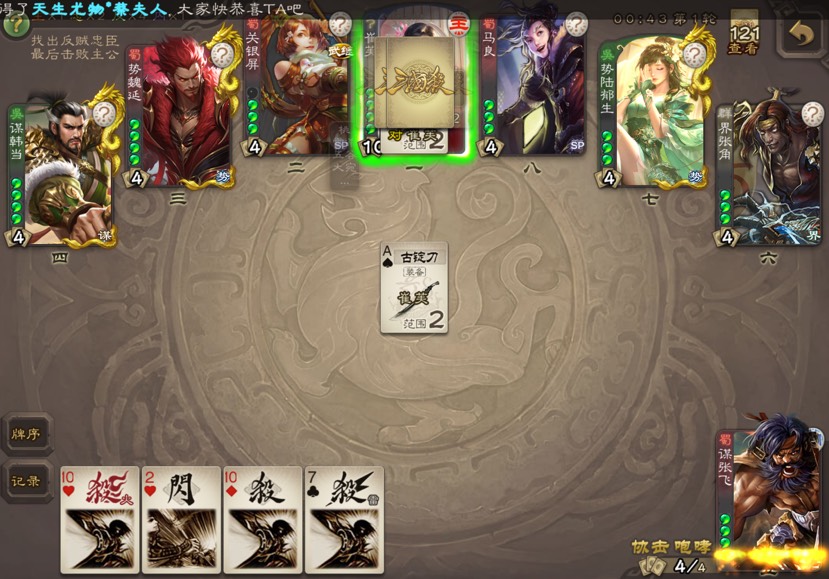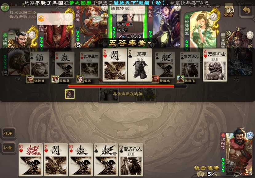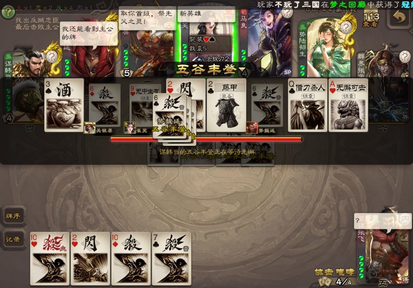 11月14号晚上8:20的时候,我正常开启了一场军八,然后就看到这个武将,听你们说可能会成为明年的权1,技能我也看不懂。这个武将开始就不知道怎么回事,皮肤先变一个,从4张牌变成11张牌,然后她那些牌用技能获得可以看到,玩家说是随机体验。她打关银屏(反)后火龙果(忠)贴乐后,关银屏打火龙果,火龙果掉一滴后主公也掉一滴,最后也是因为这个死了,所以我不明白这个武将有什么强度?