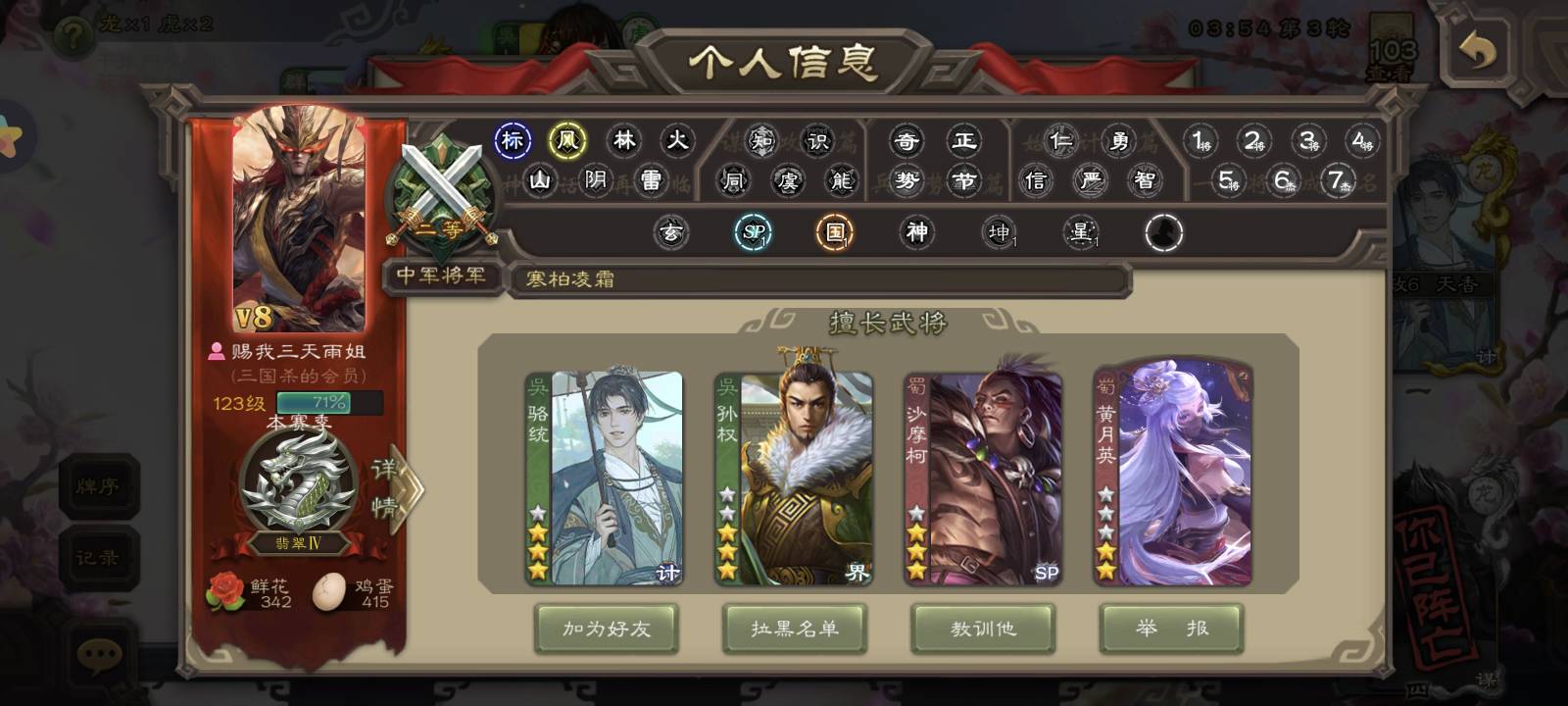 秒杀换了个骆驼,3号位的手牌被我打空了我玩的谋高顺3号是星徐晃,双铁锁一火杀手上两张桃,对面另外一个队友只剩一张牌2号又加一马,最基础的难道不是?三连铁索在火杀我(30次录像结束了没法看回放)喷他还不服