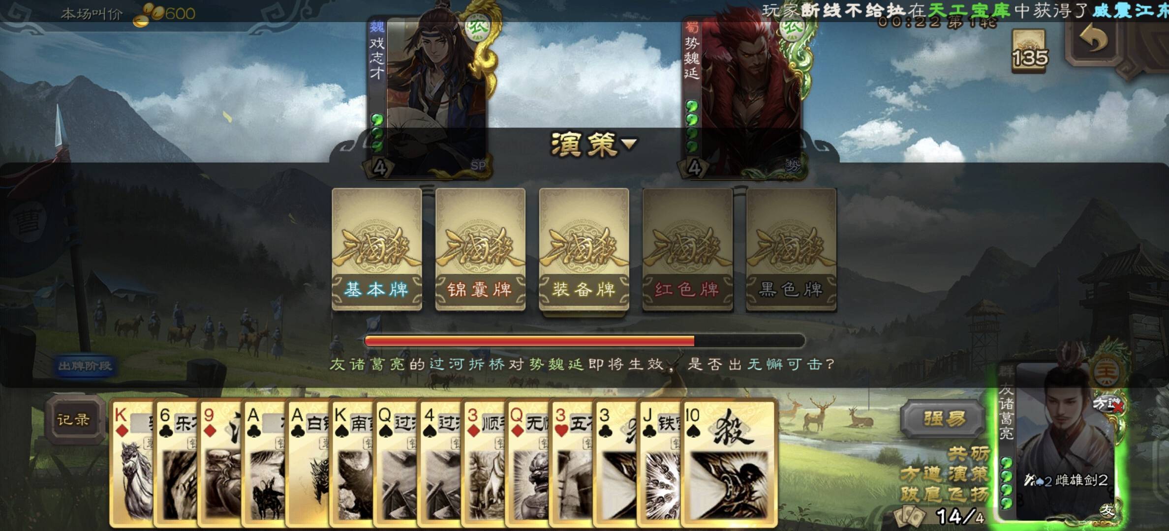 有时候打的自己都想笑,拿到这牌不笑的直接判玉玉了,锦囊比基本多,有时候就除了稳定拿锦囊剩下全是闪杀友沙摩柯,拿的锦囊还是铁索闪电