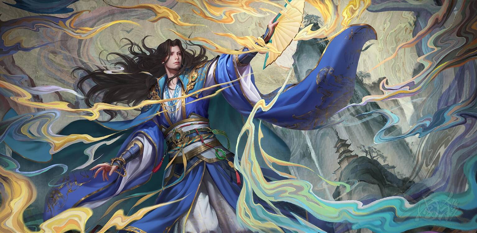 这款皮肤就较为平淡了,各方面的元素都还算不错,但是在典藏皮肤面前可以说是与日月争辉了,特效就是耍一下扇子,背景倒是挺不错的,挺符合郭嘉的气质