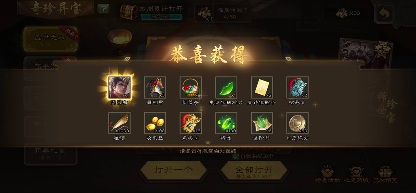 第一次出权三,当时已经30碎片了,突然出了谋吕布,虽然风评不佳,但是个人用起来真的很爽,30碎灵拿去换了界李儒