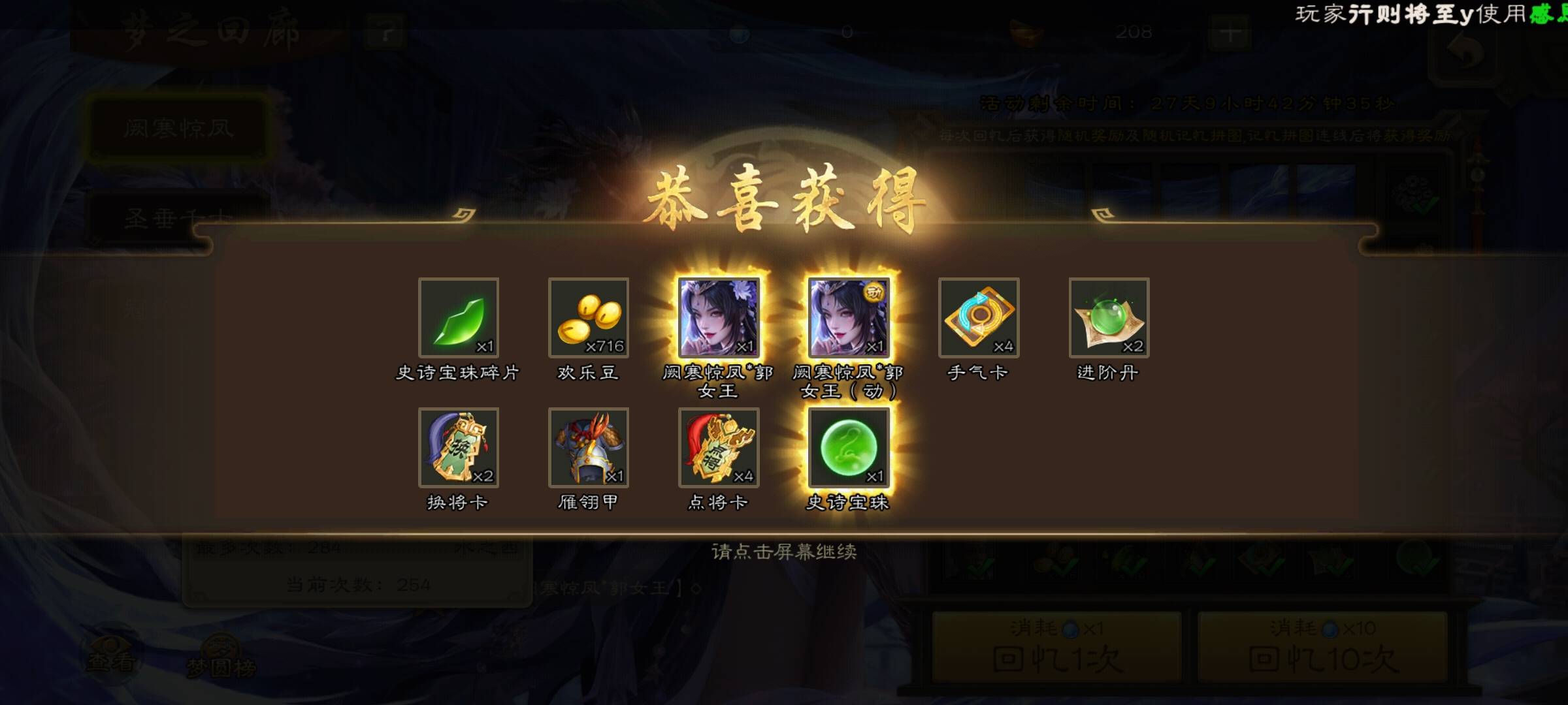 #拿下 #郭女王 #新皮肤 要不是有这武将真的不想抽,已经预感到会大保底了。他喵的最后一个格子抽了70次真的有点黑了,总共254抽出的花了90个珠子和300米。不过这次宝珠碎片出的多抽完皮肤拿了三个半珠子,加上消费回馈零零散散拿9个珠子也还行吧#三国杀