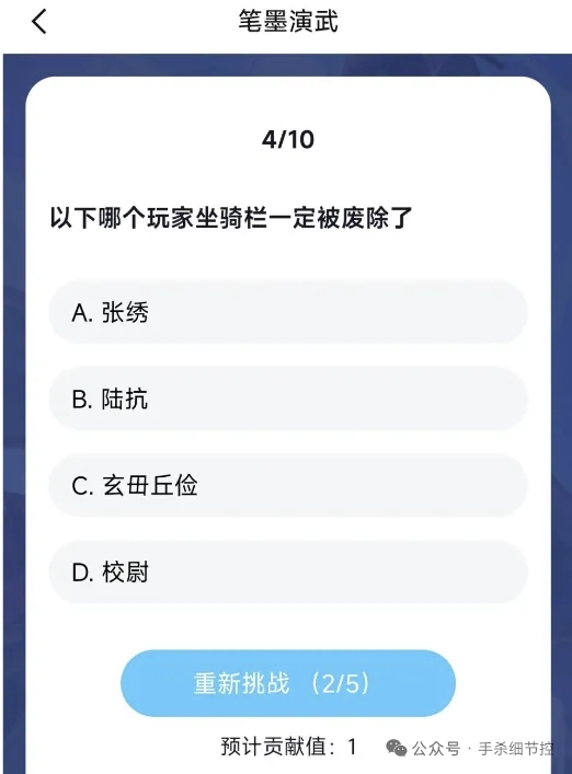 首先看题目,谁的坐骑栏一定被废除?张绣是开大后废除装备区和判定区,陆抗则是自己选择废除一格装备区,玄毌丘俭则是废除武器区,那这个题选什么,只能选D.