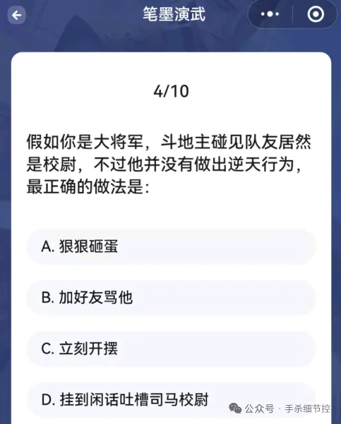 2.校尉官阶的玩家一直以来都处于三国杀官阶的吐槽最底层。因为这个官阶的玩家数量最多,游戏水平参差不齐,并且少数玩家的低水平低素质让大家对这个官阶的玩家有刻板印象。虽然谁都不喜欢校老弟,但是谁又不是从校尉过来的呢?就在最近,细心的玩家发现,官方在“笔墨演武”活动中,公开嘲讽校尉玩家,甚至粗鄙地辱骂校尉玩家。
