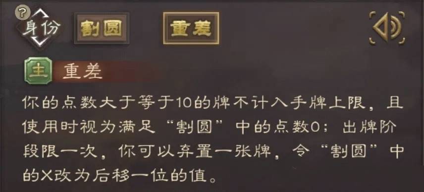 二技能“重差”,点数≥10的牌不计入手牌上限,由于小数点中的1位只能是个位数字的原因,这也提供了一定的防御能力。并且这些点数的牌视为点数0。出牌阶段限一次,可以主动弃置一张牌,让需要满足的X后移1位。两个技能有联动但不多,只是可以调整发动技能的条件。不过二技能中的视为点数0,有一说一很鸡肋,在π的四十多位才会出现0,基本是白板技能。总的来说跟书张芝差距有点大,个人觉得只有三星的强度,十分依赖初始手牌的点数质量。理论上限远高于张芝,但是下限也非常低,就是白板。
