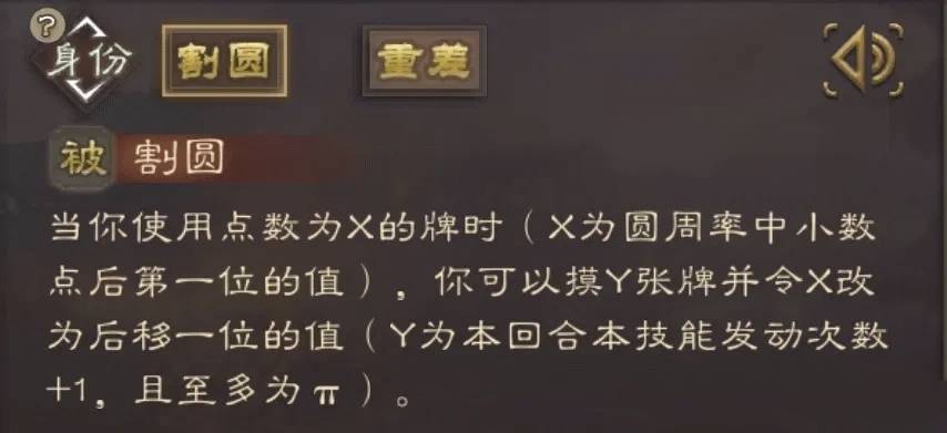 一技能“割圆”,使用π中小数点后的数值的点数的牌,可以摸Y张牌,并且发动技能次数越多,单次摸的牌越多,至多为3。上限是用1摸3,数值还是给的很足。不过单看这一个技能,发动条件确实很苛刻,很考验刷牌的质量。下面再看看与其联动的二技能。