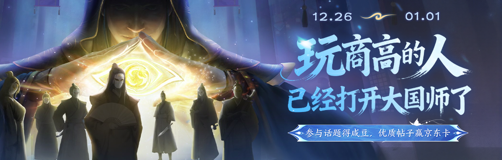 12月26日到1月1日,参与话题 #玩商高的人已经打开大国师了 得1000咸豆,将在发帖的主公中抽取5位主公获得运气奖,优质帖子还可以赢取50元京东卡奖励(`・ω・´)