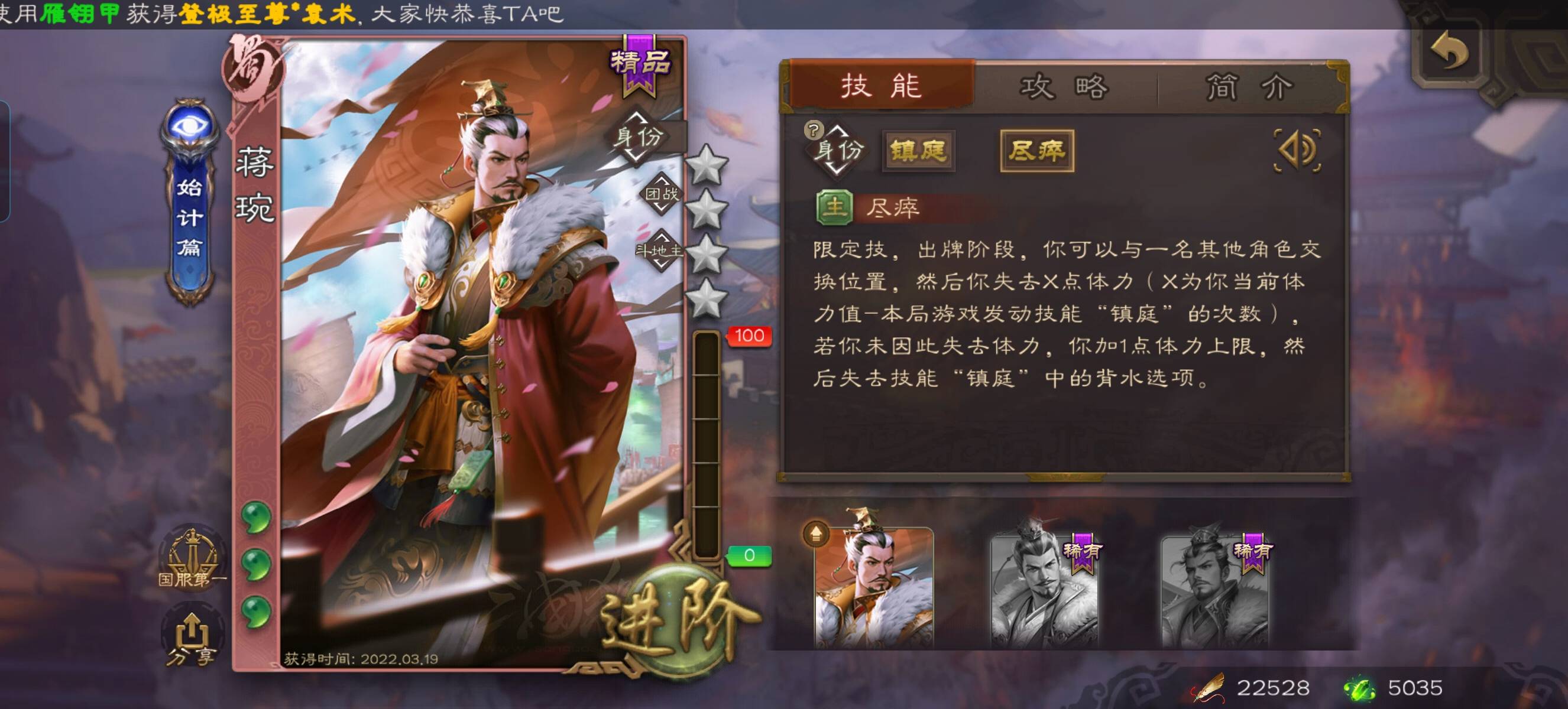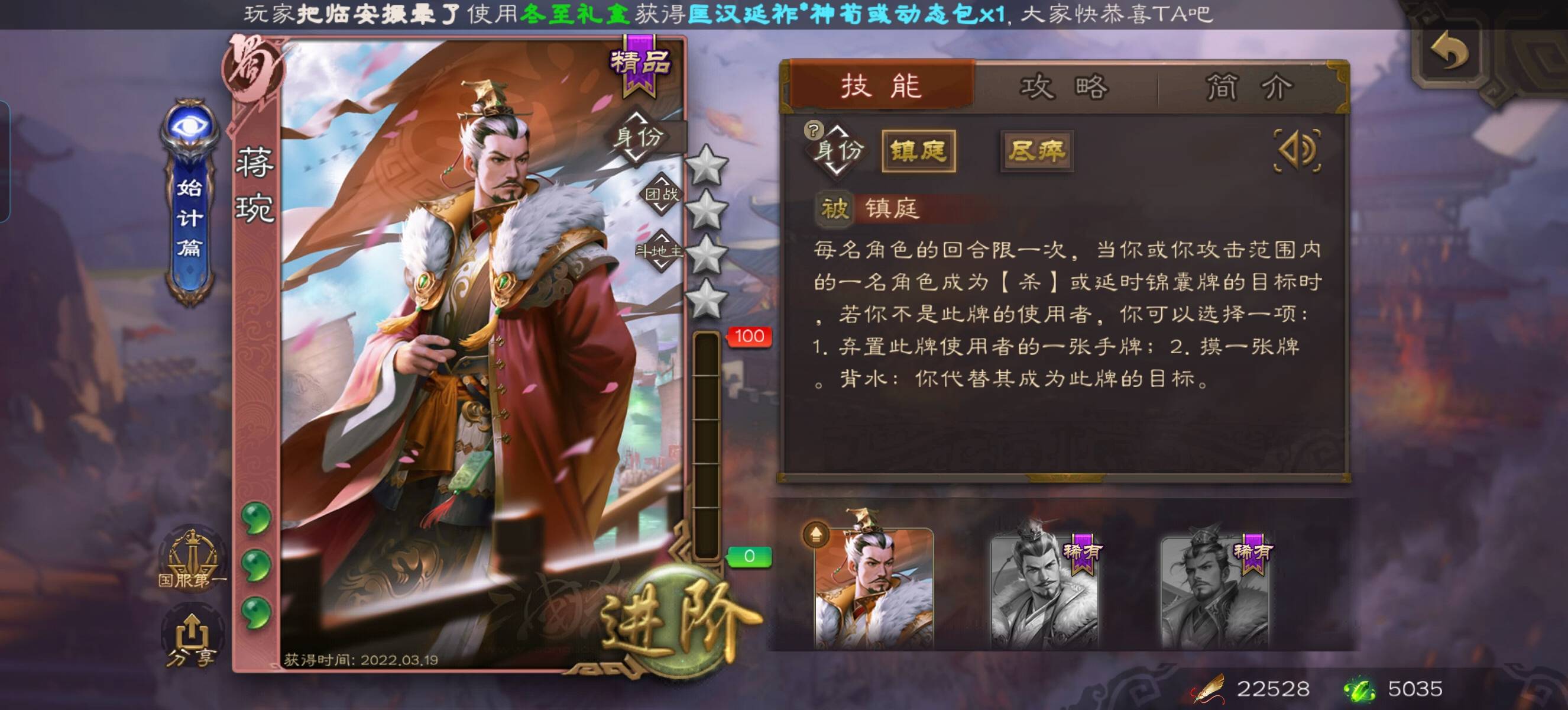 那不清楚,去年一年没玩🥲。我记得我有这个武将是开盒子的。去年没玩错过2个琳琅史诗,现在小孩张角身价共70宝珠,🤣