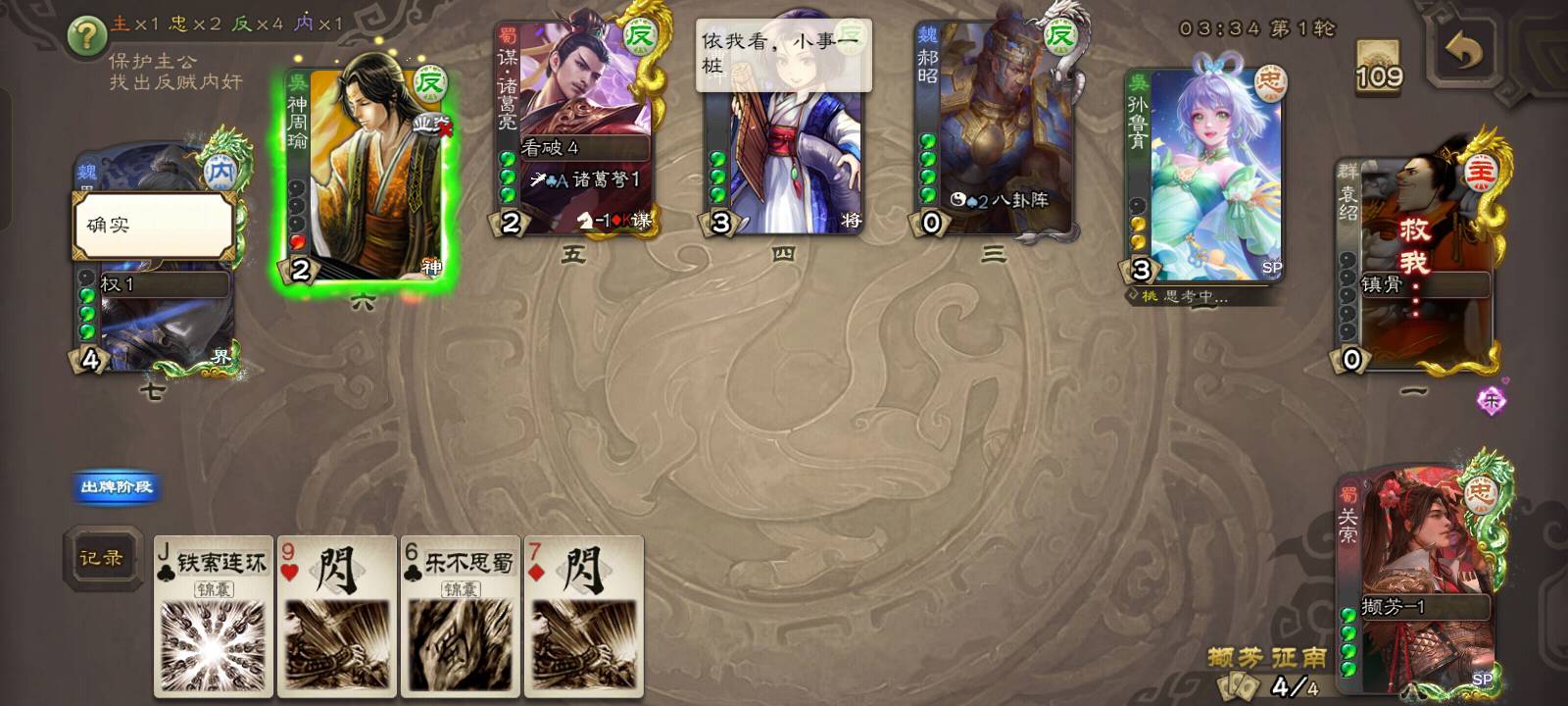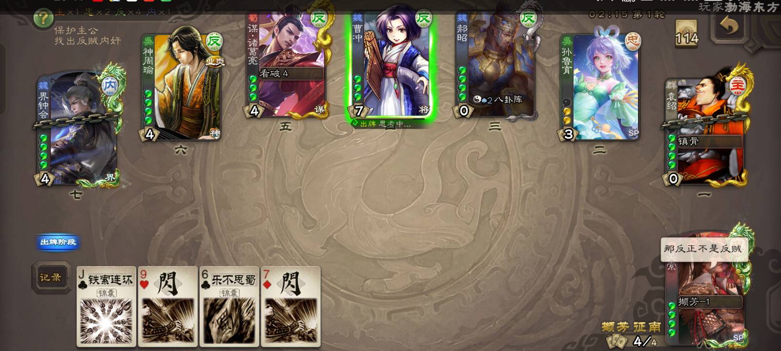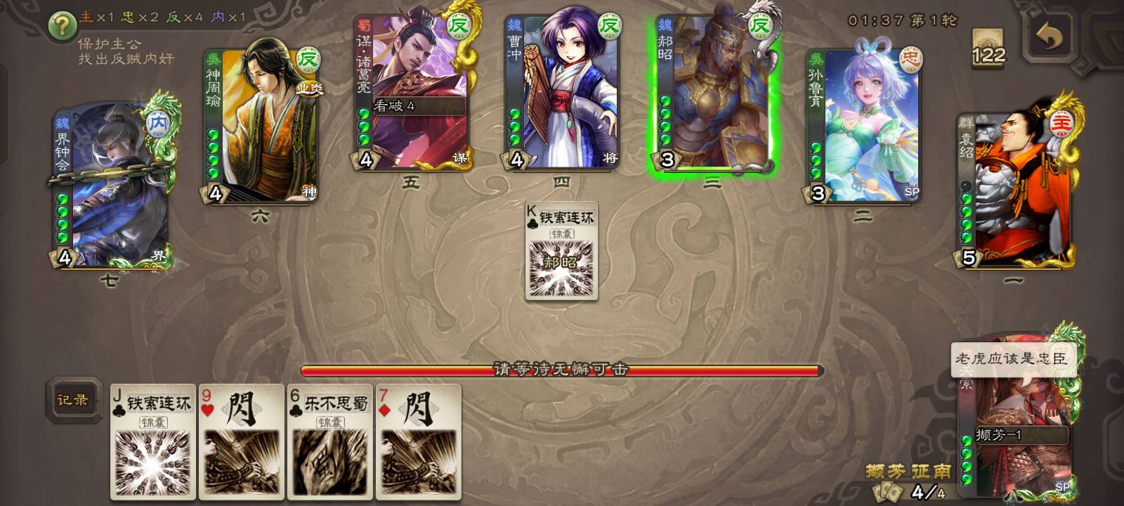 但是他直接但是他直接向3号位贴了兵,那就不可能是反贼了,约有1/2的概率是内奸,1/2的概率是忠臣。但是我凭借我卓绝的第六感,直接点出了他的身份,他就是忠臣!!!都不相信我。