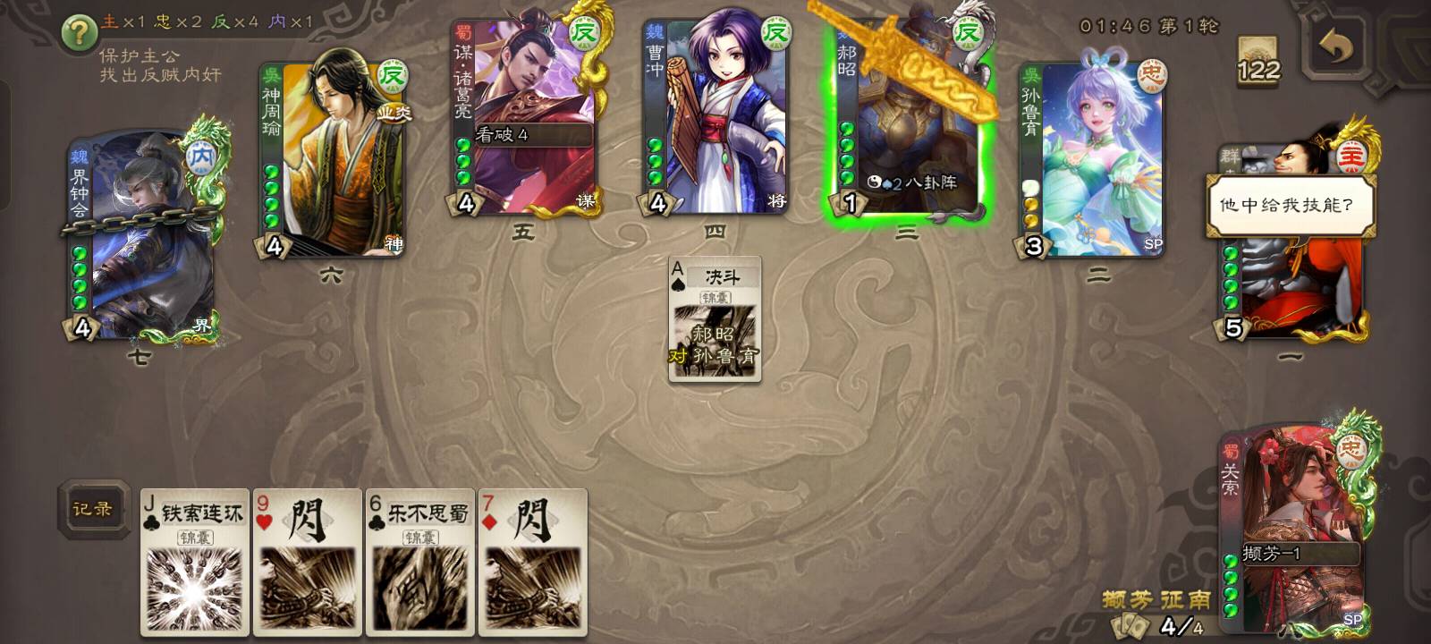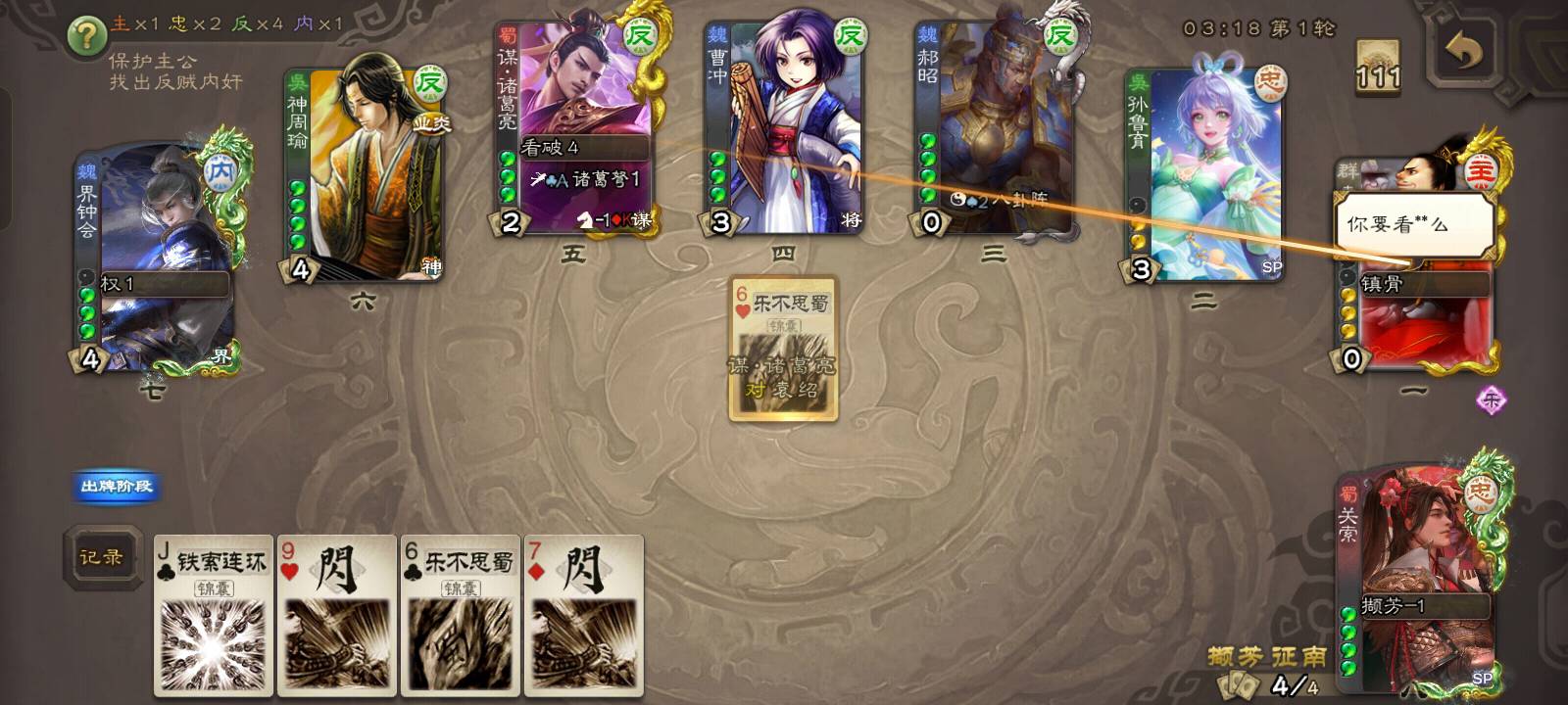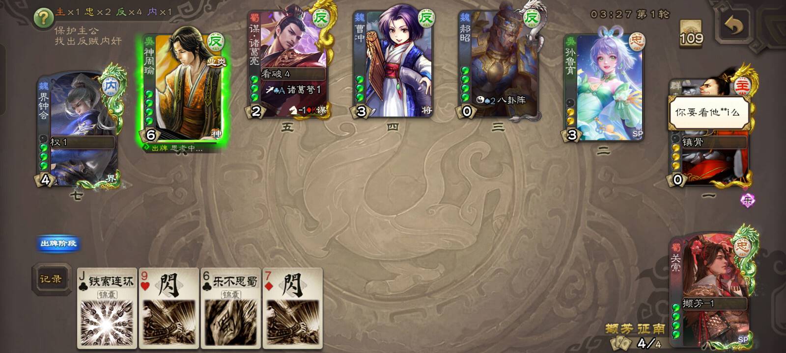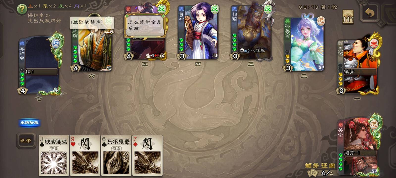 但是他直接但是他直接向3号位贴了兵,那就不可能是反贼了,约有1/2的概率是内奸,1/2的概率是忠臣。但是我凭借我卓绝的第六感,直接点出了他的身份,他就是忠臣!!!都不相信我。
