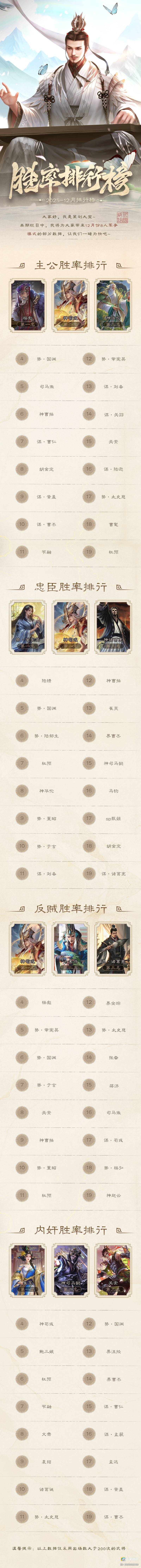 全榜是不可能的杨彪内没有清场能力忠臣等于是典型灯笼忠。地主杨彪一直都是10名开外,以前神甘宁神郭嘉农民玩的人很多甘宁以前都在农民胜率榜这俩不都是乱养杨彪