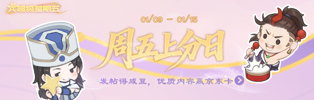1月9日-1月15日,发帖带话题 #周五上分日 得1000咸豆,还会在发帖的主公中抽取5位主公获得运气奖50元京东卡,优质帖子还可以赢取50元京东卡奖励!
