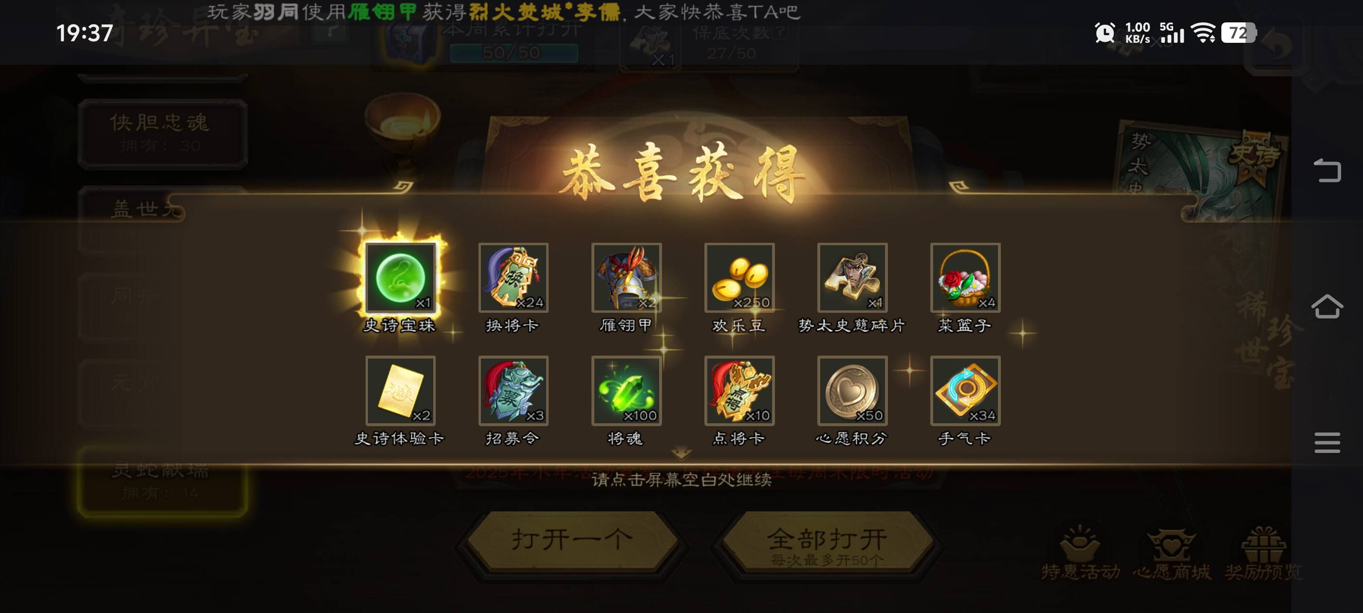 来自版块:三国煮酒从9月15号到今天太不容易了,卡子的爆率真的太低了,节越令每次都不差事,就是很少充钱了,每期有强力武将的天宫都坑我八万,哎!v12一个权一,伪权一都没出过,权一宝珠换了两个老刘.还有眼泪时代的六万五,权三武将宝珠换了四个,火龙果,绿苍蝇,诸葛,庞德公,活跃高了白朴的盒子不出货,每天也就打打任务,偶尔连胜多玩一会,越来越没意思,都说卡子的流水越来越低,盒子爆率这么低谁还充钱开,现在心态已经放平了很多了,每天养养老就好了
