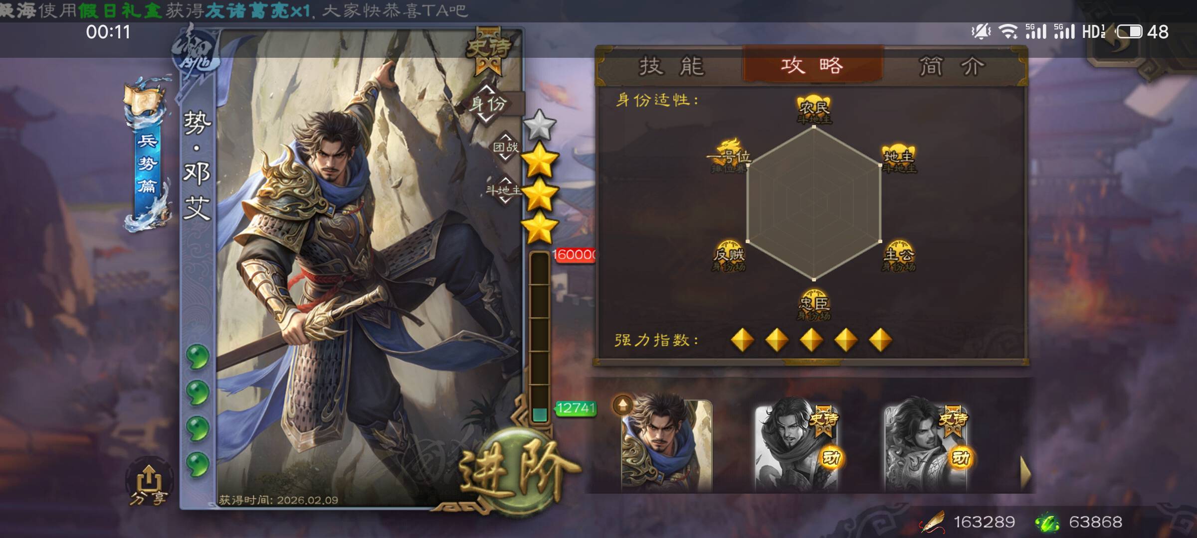 #势邓艾 #势邓艾 继2月8号两个小号连出势邓艾后,2月9号凌晨24点11分大号又出了势邓艾,真不敢相信😮!本人主打斗地主,目前还不会玩势邓艾,有没有将军指点一下,如果势邓艾地主的情况下,对面橘子妹或者阎象这类T0辅助武将,开局要刷什么牌才能赢下比赛呢🤔🤔