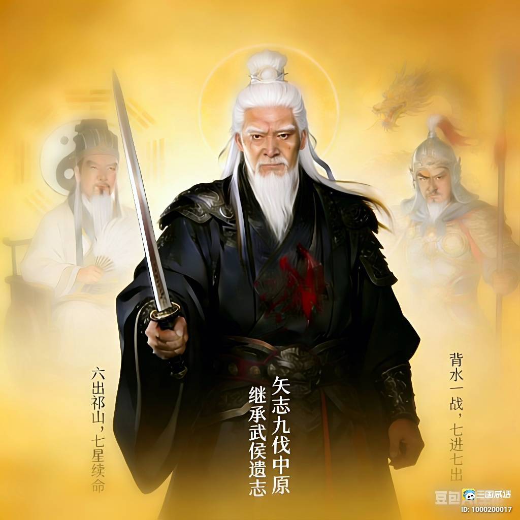 姜维(202-264年),字伯约,天水冀县人。本仕曹魏,遇孔明而归汉;既承遗志,统锐旅以挥鞭。屡次北伐,忠勤不改;多年征战,思虑愈坚。洮西破敌,声名显陇右;剑阁拒险,雄关锁秦川。虽伪降而志在复国,纵身死而胆壮云天。陈寿谓其“粗有文武,志立功名”。