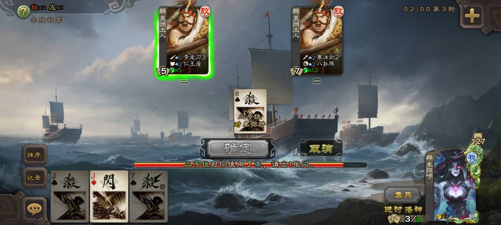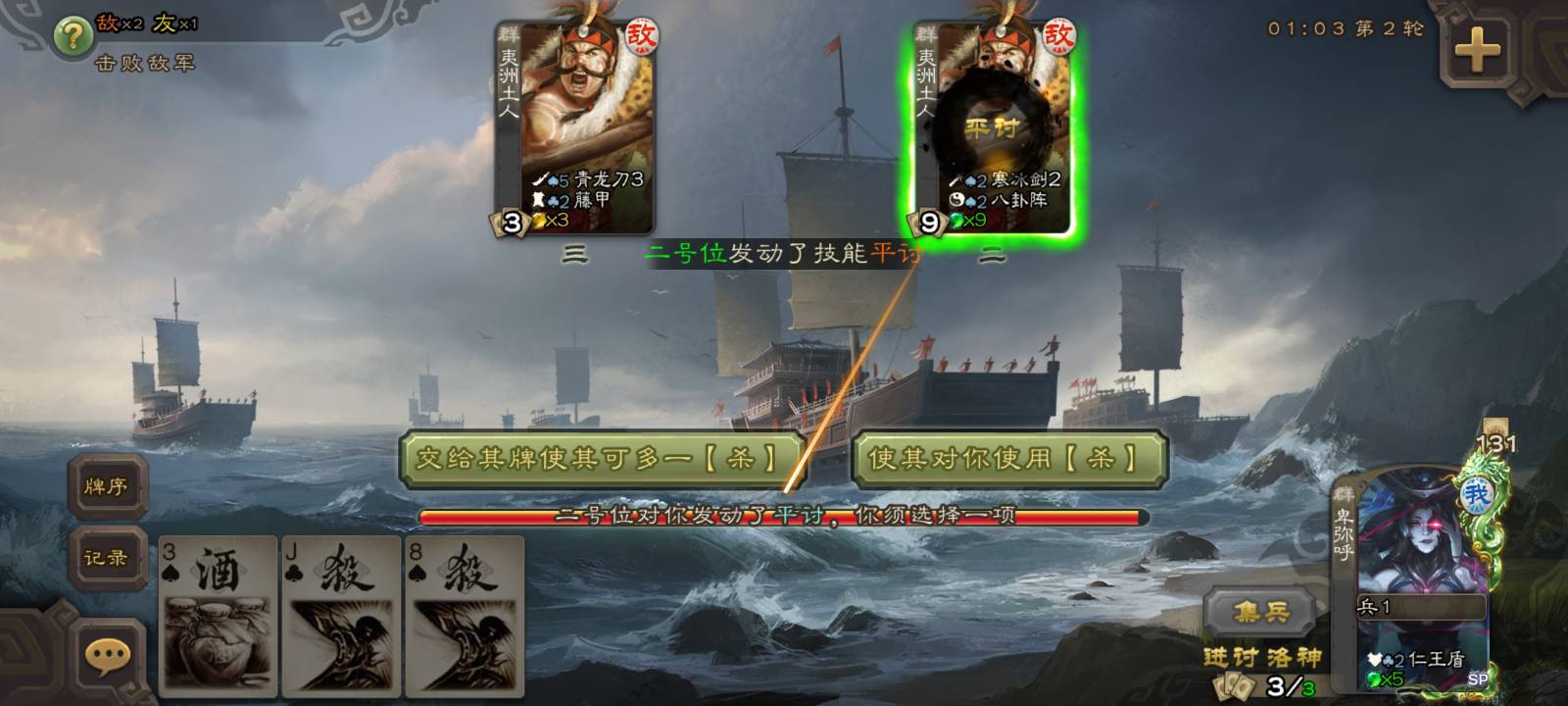 你的技能输出搭配又不够快速击杀3号,防御又不够,过牌又不大连红桃防恩怨都做不到,也不刷藤甲去防平讨,建议去b站看一下攻略,或者再琢磨琢磨技能