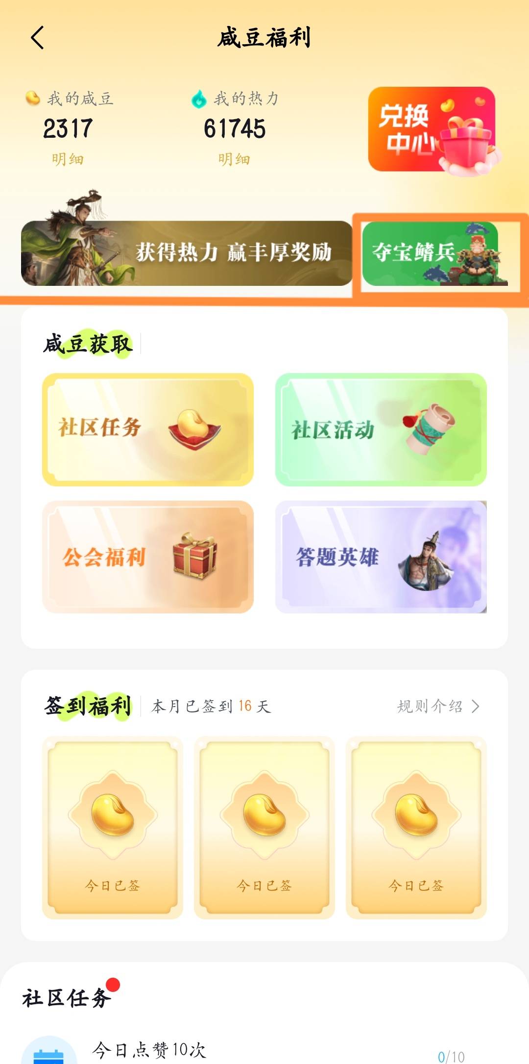 1.进入三国咸话APP——签到福利——夺宝鳍兵,完成每周任务后即可获得热力值(任务完成可能会存在延迟,将军们可以多等待一下),能够加速获取咸豆