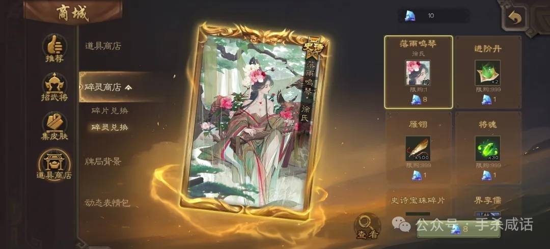 早期时,徐氏还是有一定强度的,既能过牌,还可以积累一波爆发,但随着游戏的发展,这种强度的武将早就不够看了,因此这个时候再花8碎灵,兑换皮肤显然有点浪费。