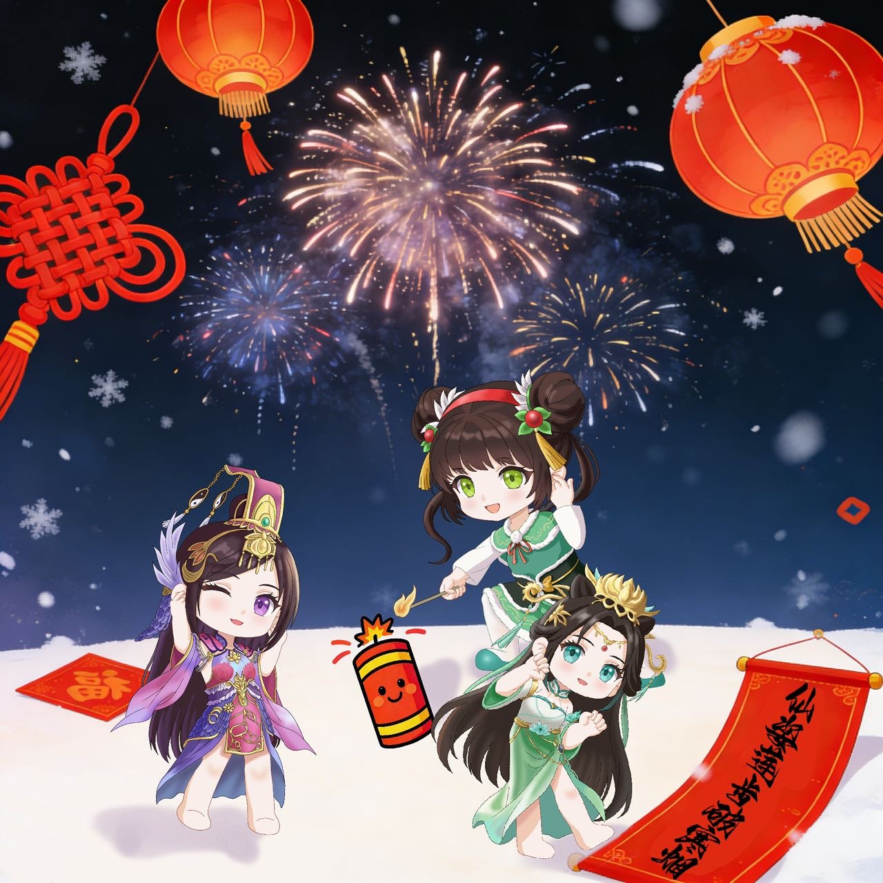 哈哈说正事~画手板块专属社区活动,也就是每周五的我画你猜,马上举办到300期啦!为庆祝这个值得纪念的日子,这次是以春节为主题的三国杀Q版武将合绘,每位画手都选择了自己喜欢的武将来创作,那既然画手们都这么忙碌的动起手来,那就劳烦各位也动下脑子帮忙出出主意呀!没错~今天的活动内容是对春联,以下为画手组出的上联,连续七天每天都有一个上联请聪明的你来对!需要注意的是,出的上联已包含图中两名武将,你们需要利用剩下的武将素材(孙鲁育)对下联
