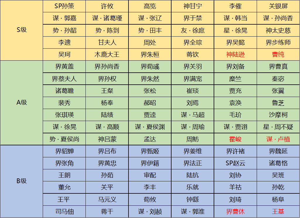 每位玩家均可以使用将池中的武将,在选将阶段开始前,双方队伍中的一名玩家可以禁用对方2个武将。本届赛事将池新增神陆逊、曹纯、谋·卢植等武将,具体将池如下: