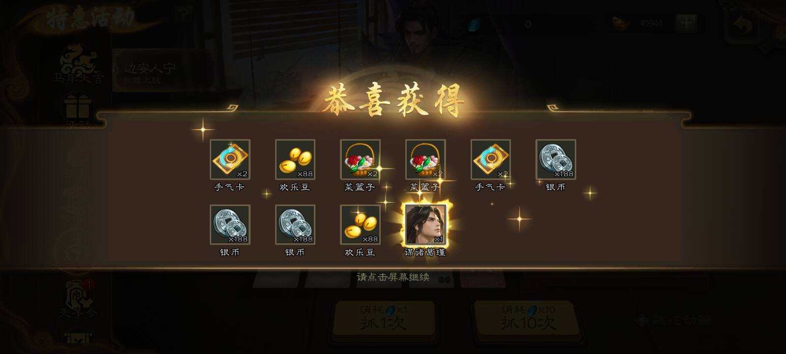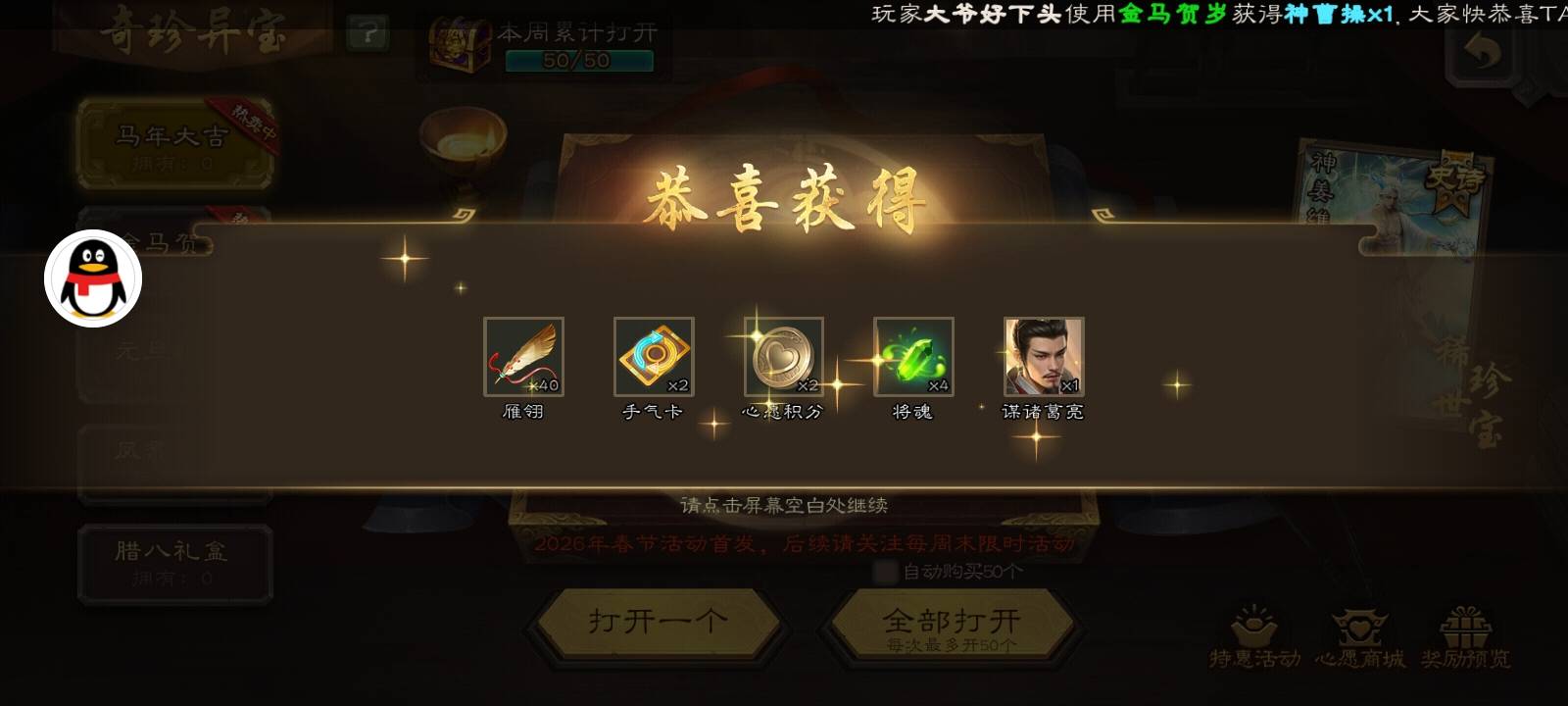 今天也是哥们的生日,便想上线领一下生日贺礼顺便把攒的天宫石抽了,结果顺手的两盒子直接出谋诸葛了哈哈😀😀😀,然后天宫也是第一个直接出武将了还没保底,今天是卡宝,希望也能将我的好运分享给诸位将军😊😊😊